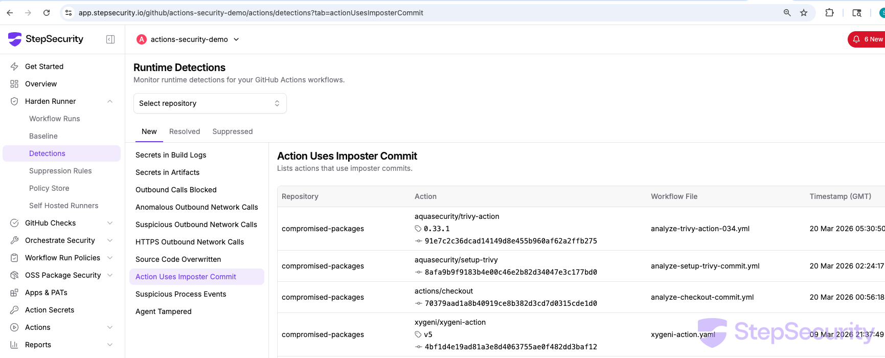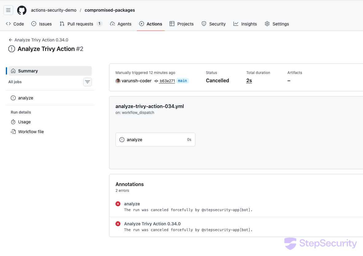 - Summary: app.stepsecurity.io/github/actions-security-demo/compromised-packages/actions/runs/23326425755