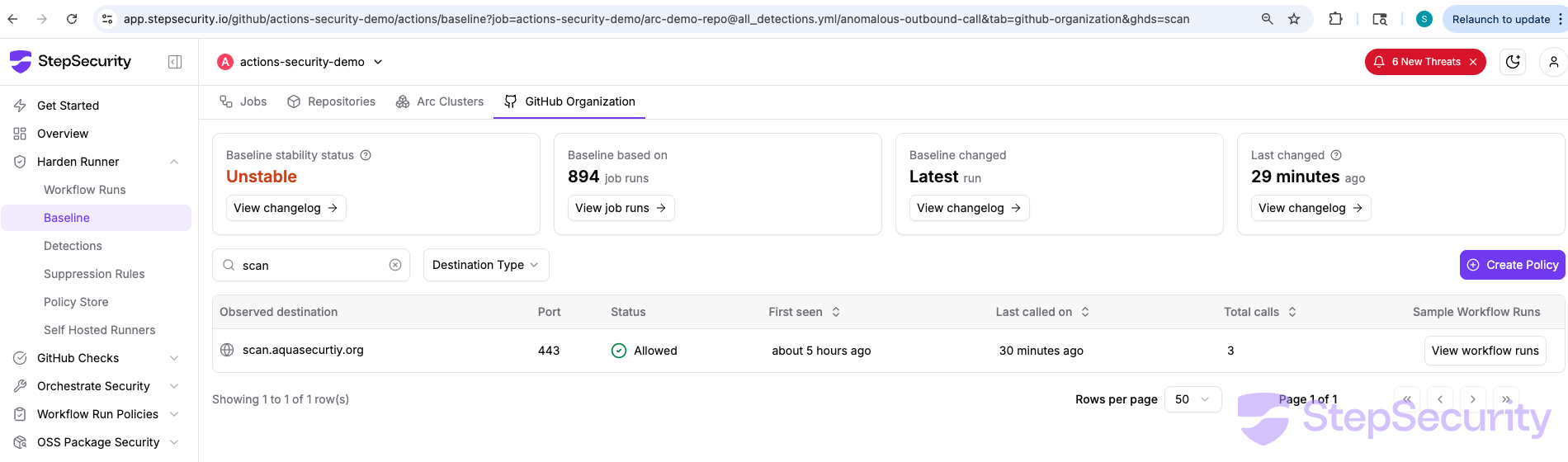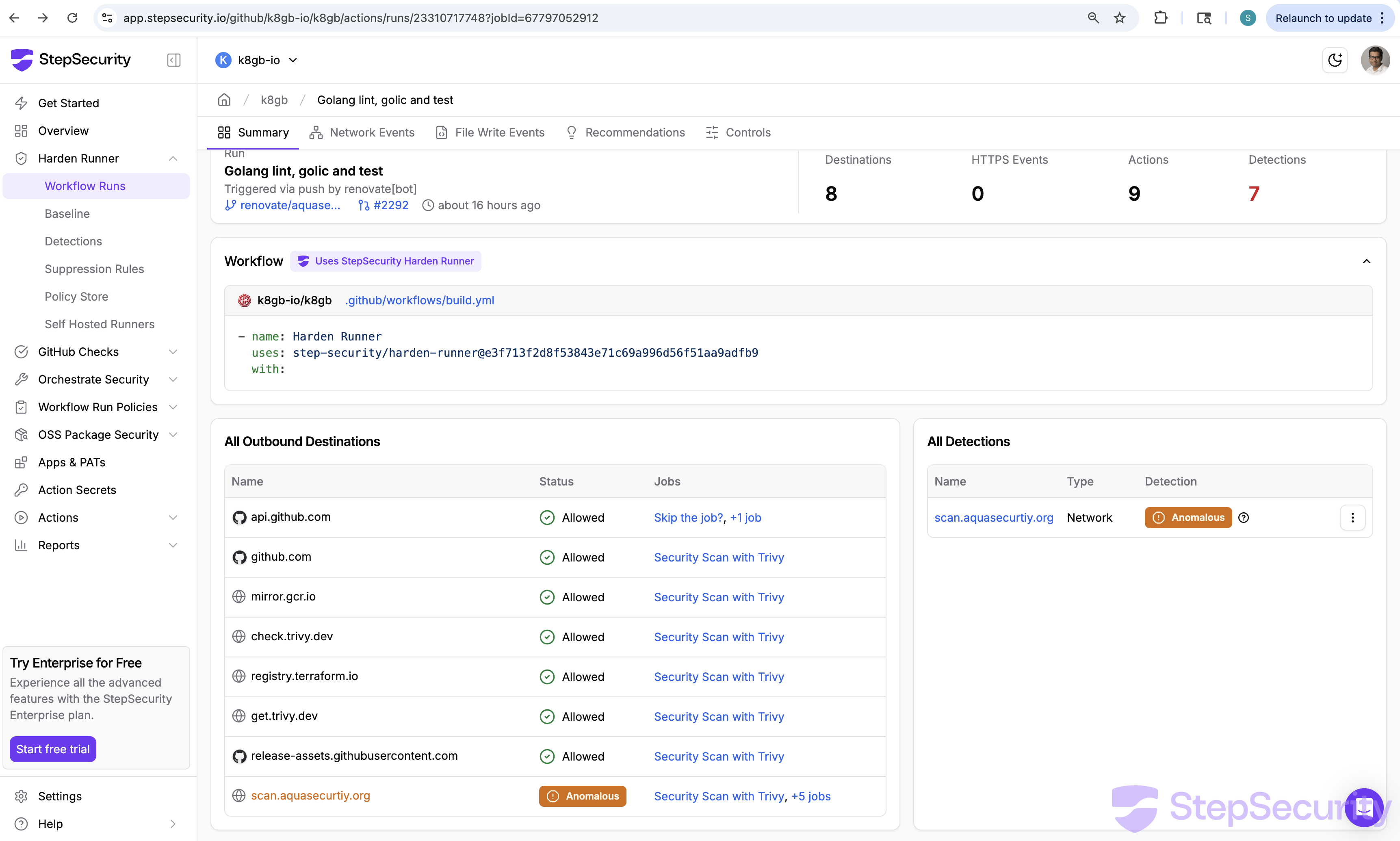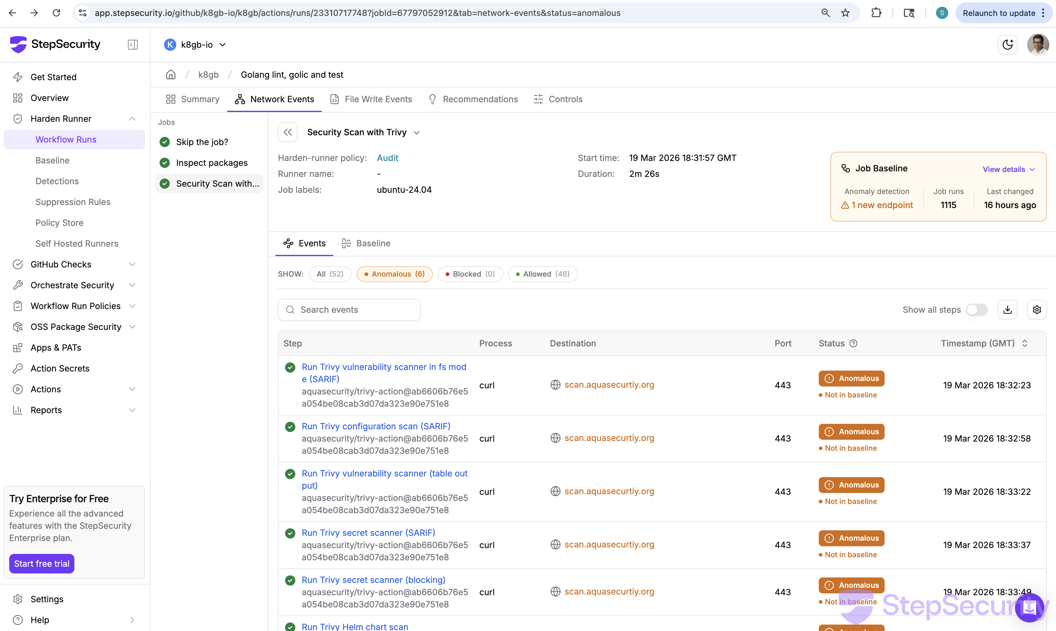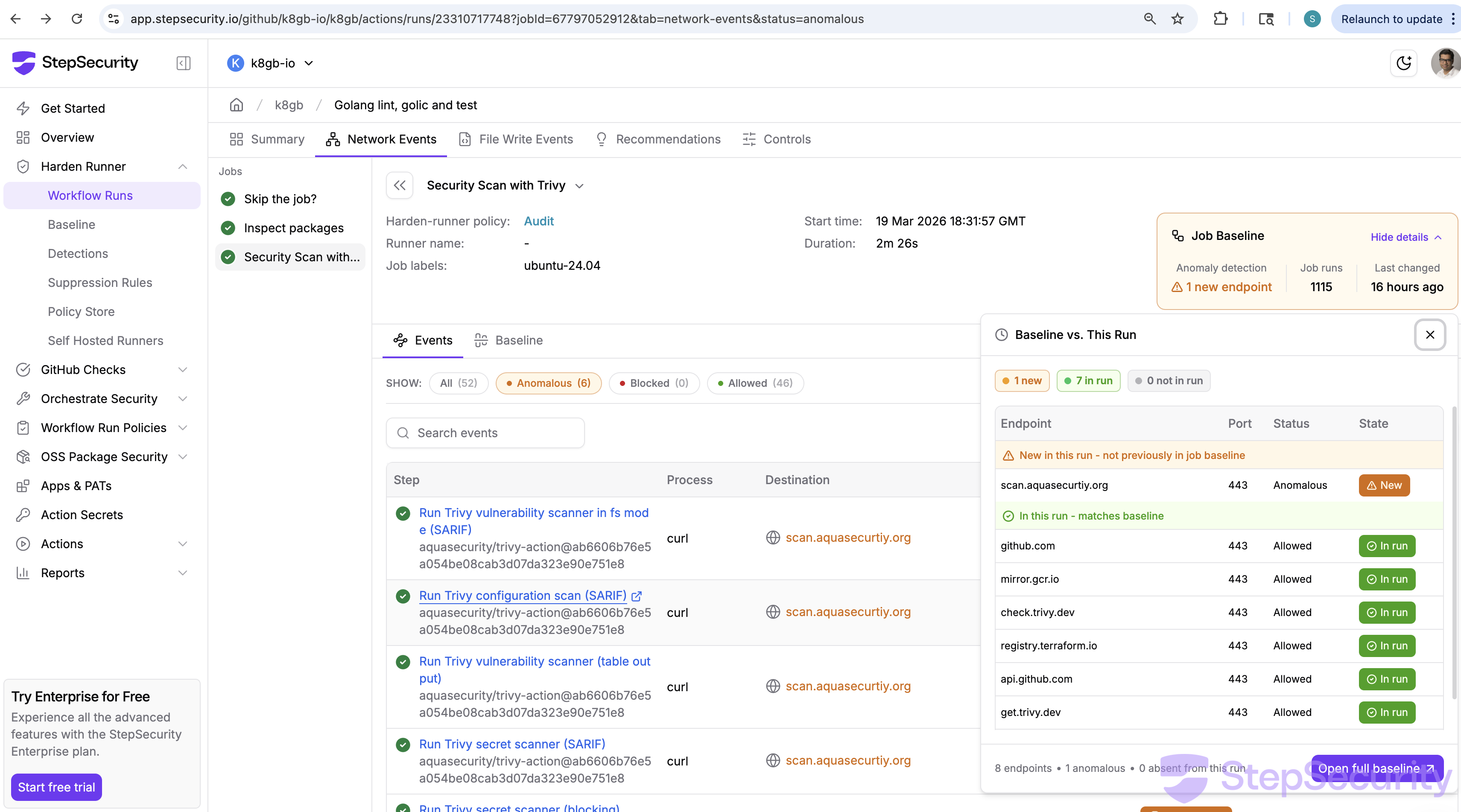 Harden-Runner correlates outbound network calls to each step in a workflow and builds a baseline of expected network destinations over time. When a new destination appears that is not in the baseline, it is flagged as anomalous. In this case, scan.aquasecurtiy.org had never appeared in any previous run of this workflow — making it immediately visible.