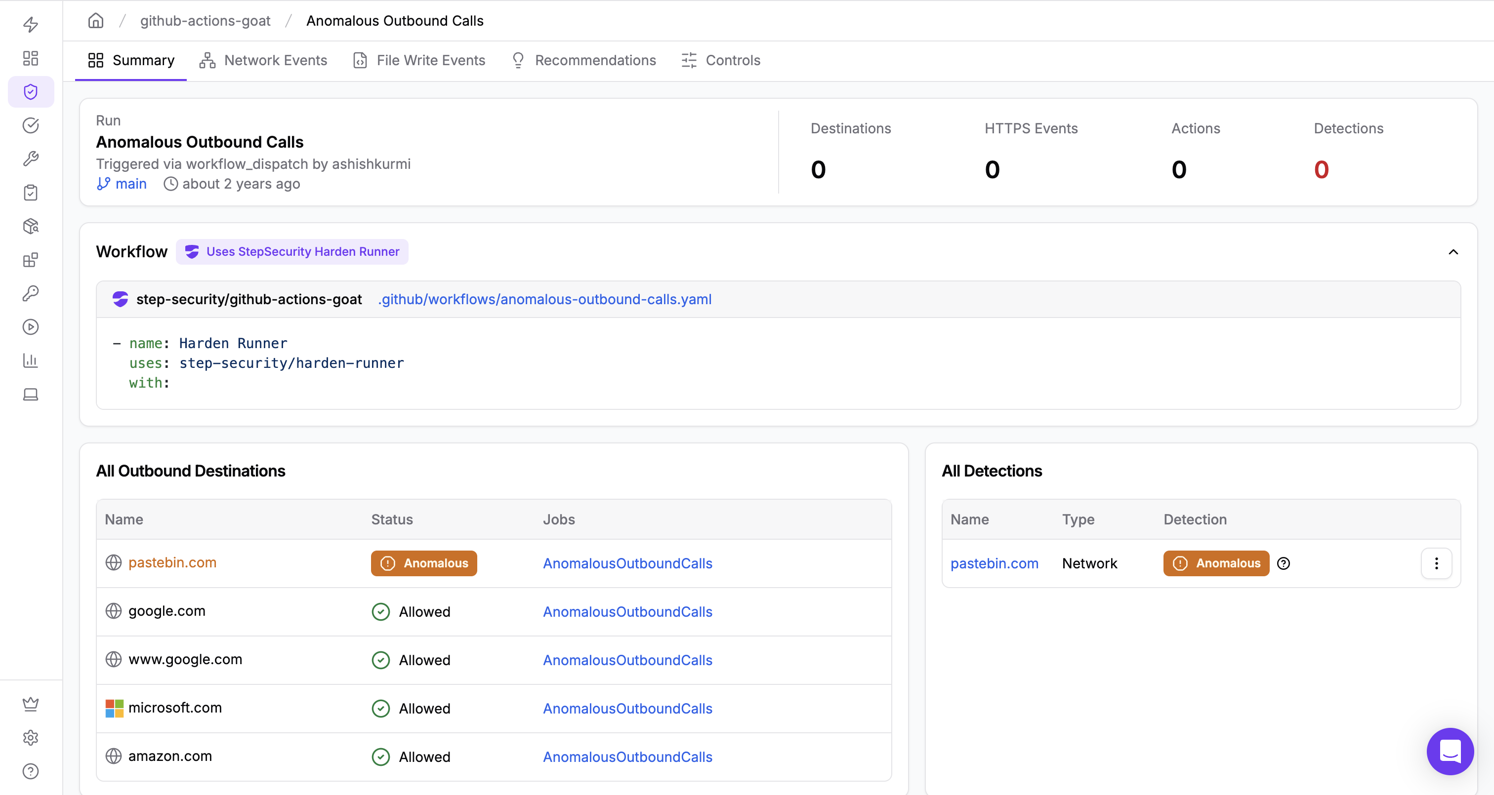For GitHub-hosted runners, add the Harden-Runner GitHub Action to your workflows to receive notifications about anomalous outbound calls. If using self-hosted runners, no additional action is required – all workflows are automatically monitored.