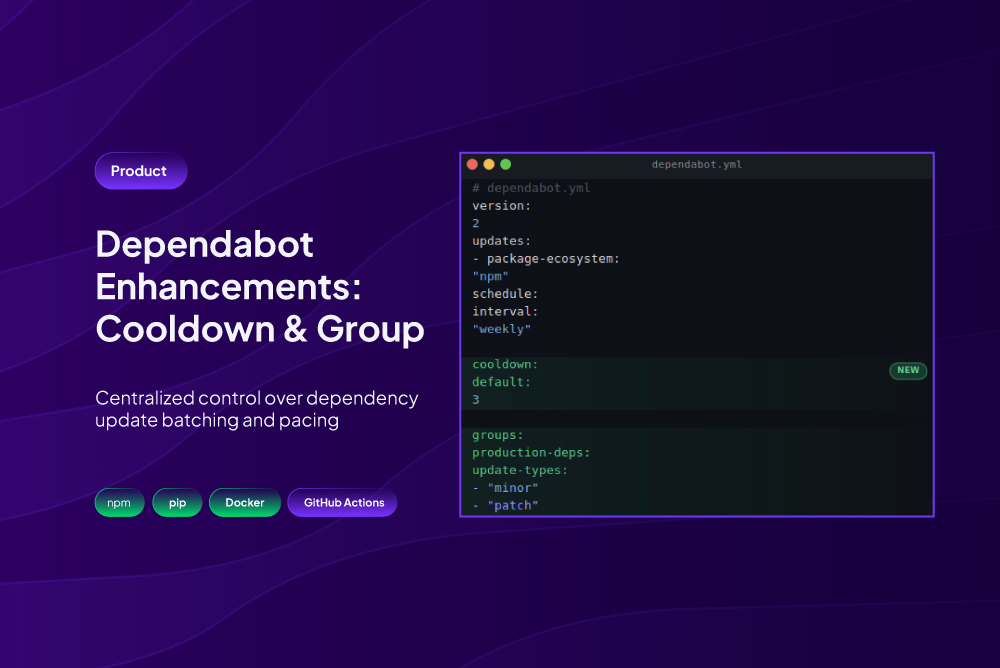 StepSecurity now supports cooldown and group attributes for Dependabot configuration management. These additions give organizations precise control over how dependency updates are batched and how frequently they arrive, across npm, pip, Docker, GitHub Actions, and other Dependabot supported ecosystems.