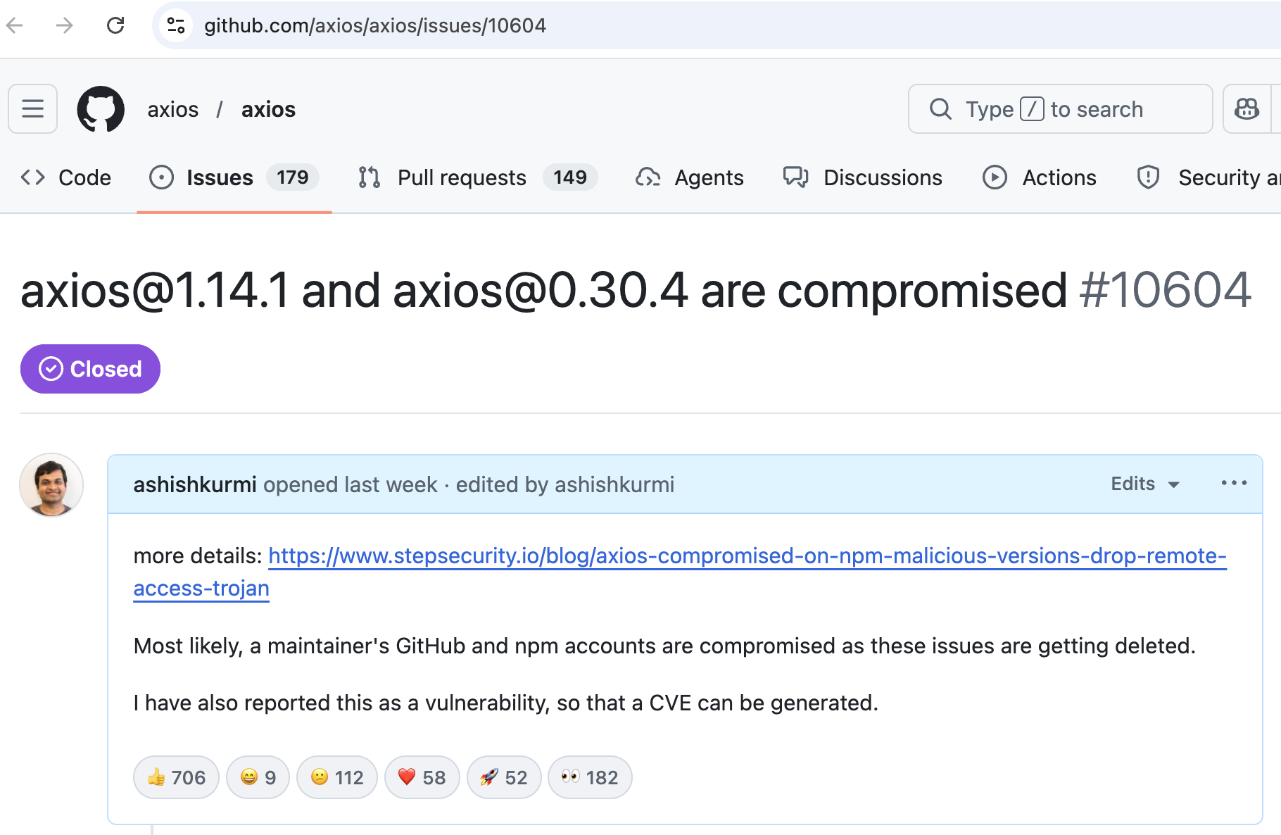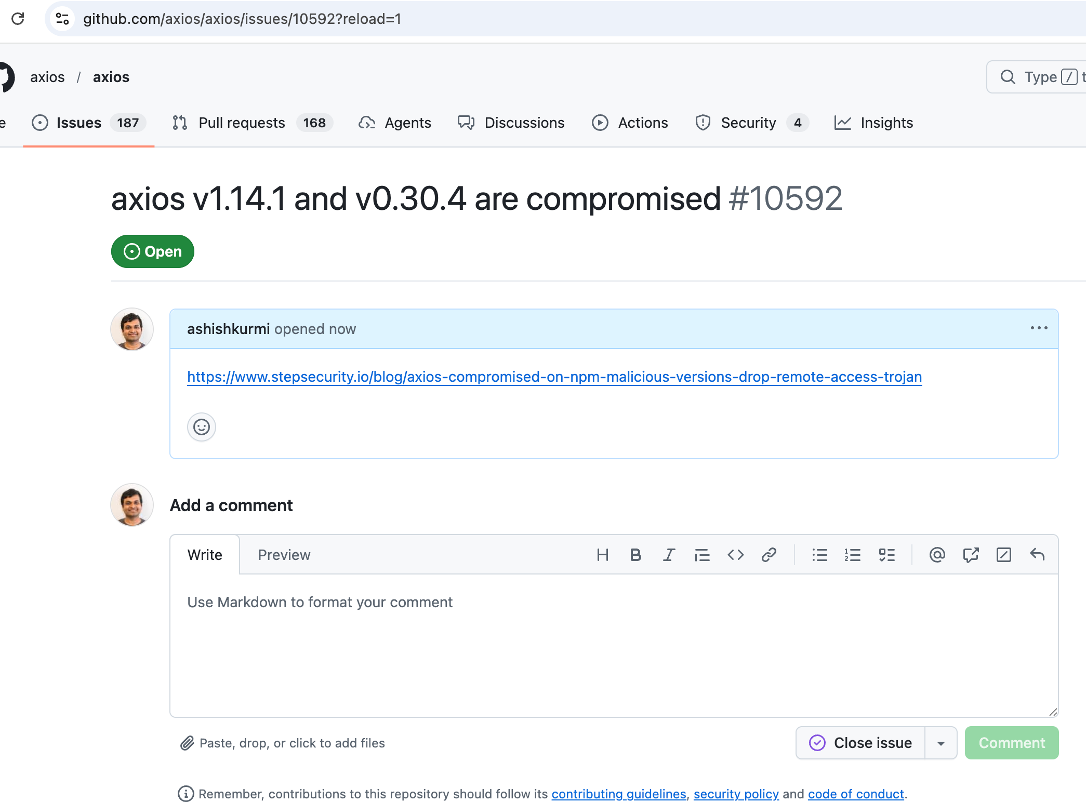 Then Ashish turned to the axios GitHub repository and created an issue to work with the maintainers to alert the community.