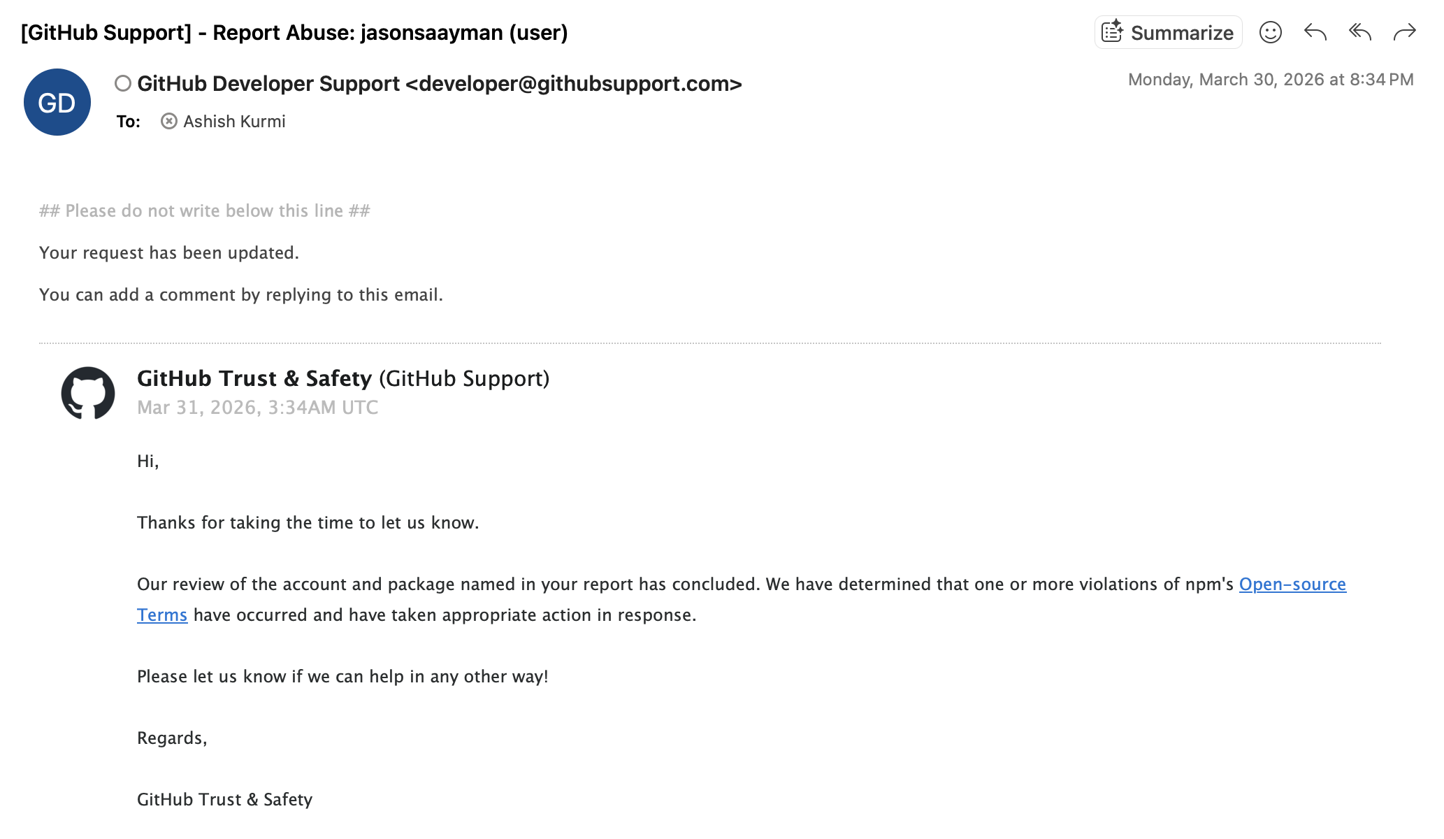 While this cat-and-mouse game played out on GitHub, Ashish also raised a GitHub account abuse ticket, explaining that the maintainer's account appeared to be compromised and was being used to delete legitimate security advisories. Both GitHub and npm support acted swiftly. GitHub suspended the compromised maintainer's account, stopping the issue deletions and preventing any further malicious actions from that account.