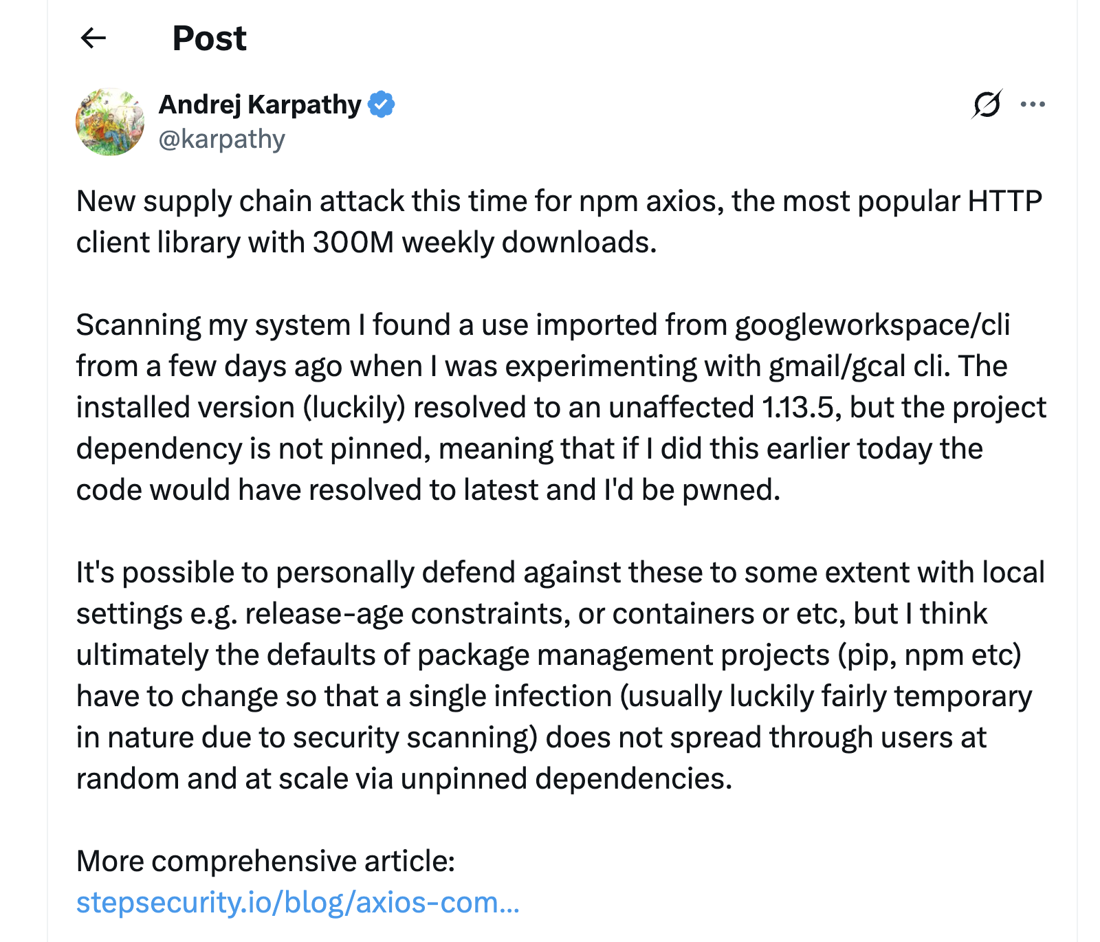 We published a blog post with a summary of our findings, including the compromised versions (1.14.1 and 0.30.4), the injected plain-crypto-js dependency, and the C2 domain. Ashish posted an advisory on LinkedIn breaking down the key indicators of compromise so that developers scrolling their feeds would see the warning.