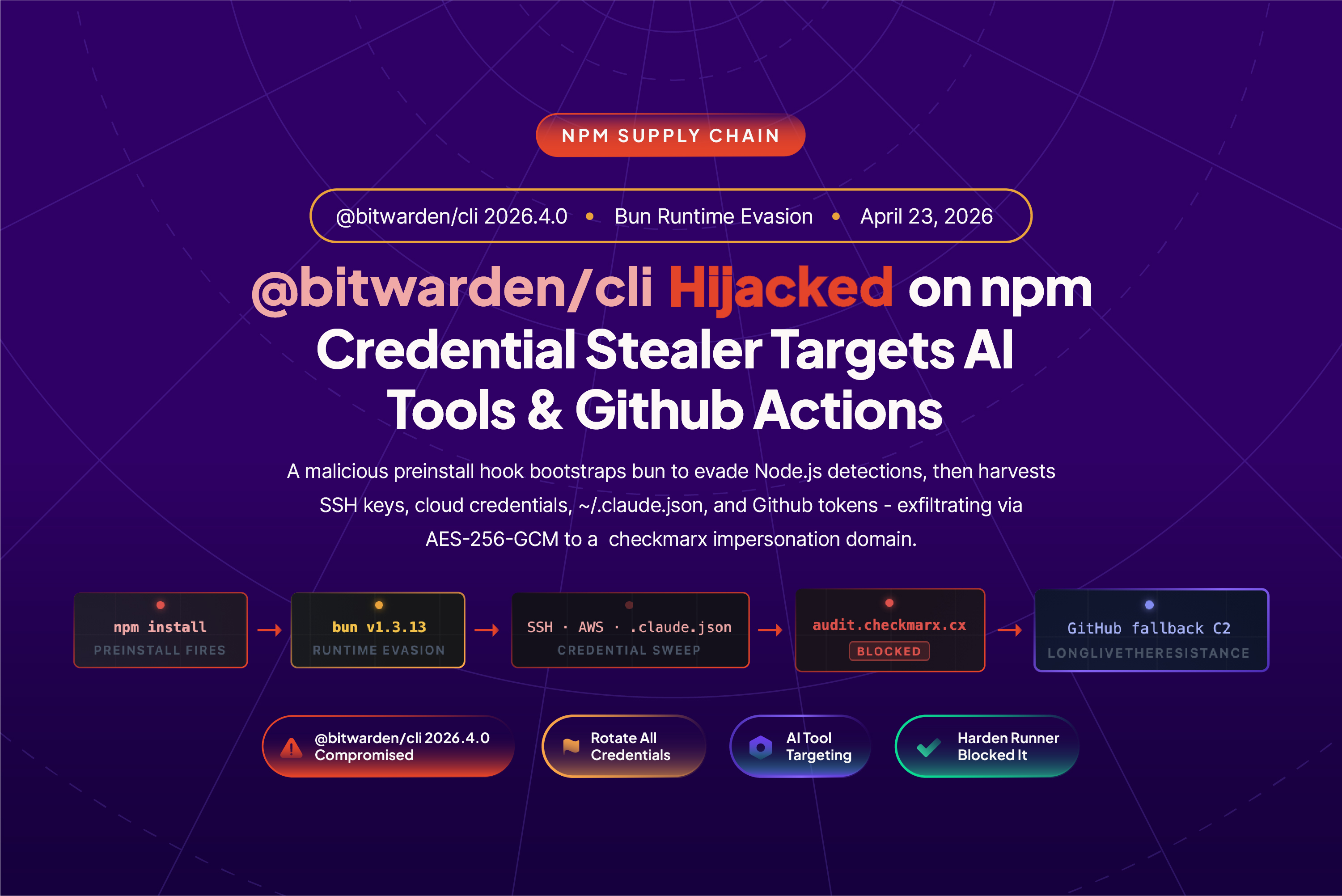 Both files were confirmed malicious and @bitwarden/cli@2026.4.0 was added to StepSecurity’s global block list immediately. The npm Compromised Package Check now automatically blocks any PR that introduces this version.
