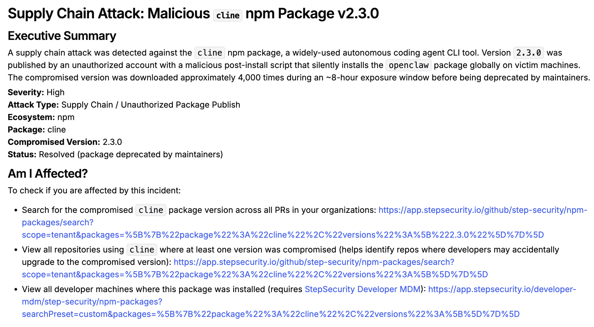 On February 17, 2026 at 11:40 UTC, the StepSecurity npm monitoring system detected a suspicious release of the cline npm package. Version 2.3.0 of this widely-used autonomous coding agent CLI was published with a malicious post-install script that silently installs a secondary package, openclaw, on any machine that ran npm install cline.