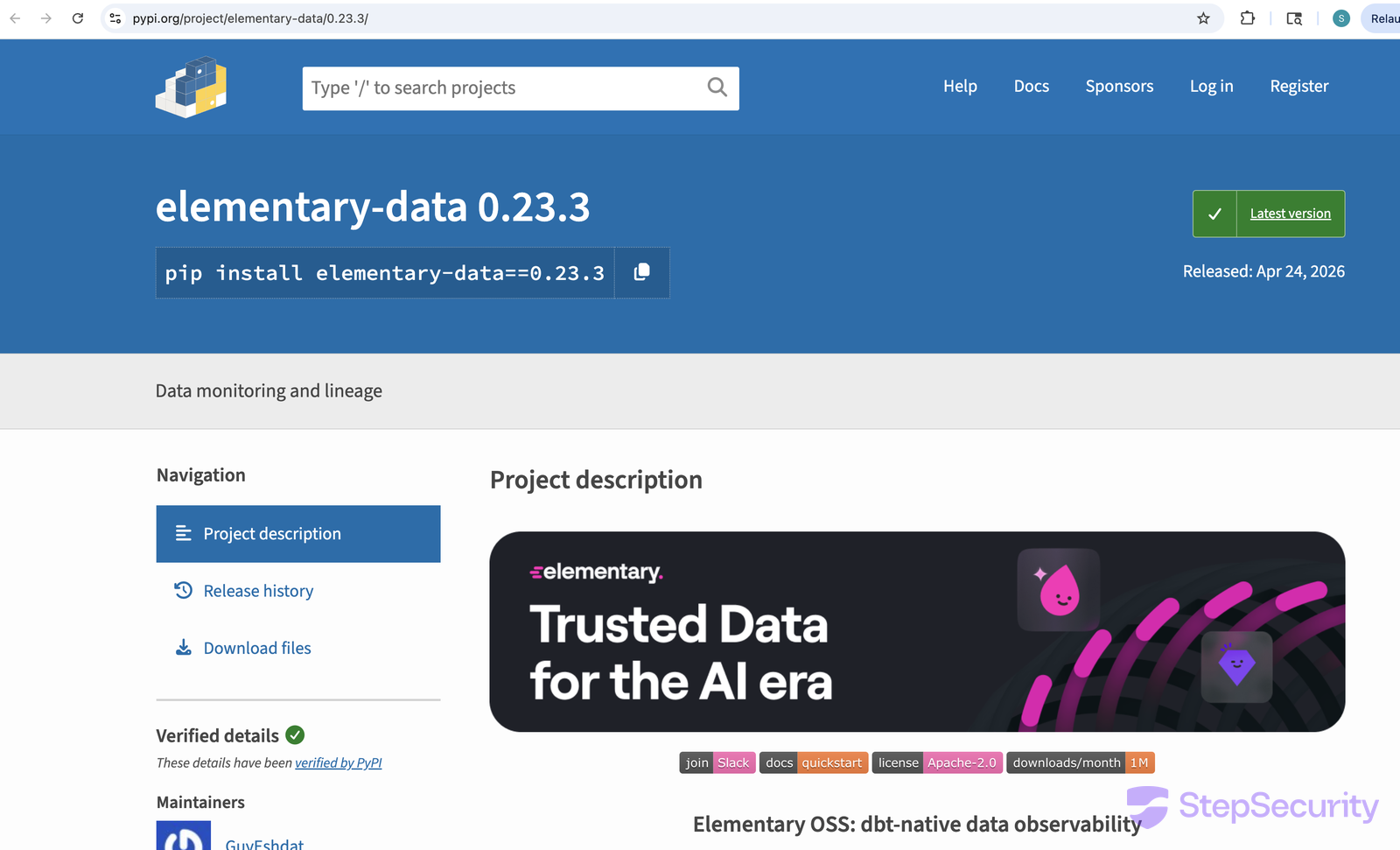 A malicious version of elementary-data (0.23.3) was published to PyPI and is, at the time of writing, still listed as the latest release. elementary-data is a widely deployed Python package for dbt data observability.