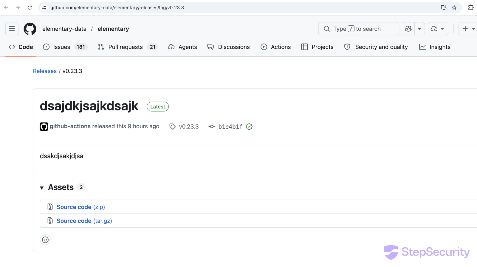 The corresponding GitHub release is the giveaway. The release name, dsajdkjsajkdsajk, and body, dsakdjsakjdjsa, are gibberish - an attacker keyboard-mash that no maintainer would have signed off on. The release was created by github-actions[bot], not by a human, and is still labelled "Latest" on the project page: