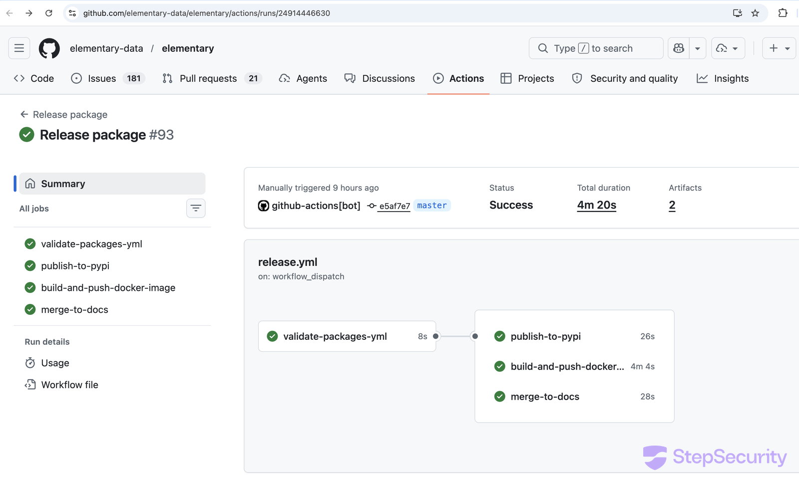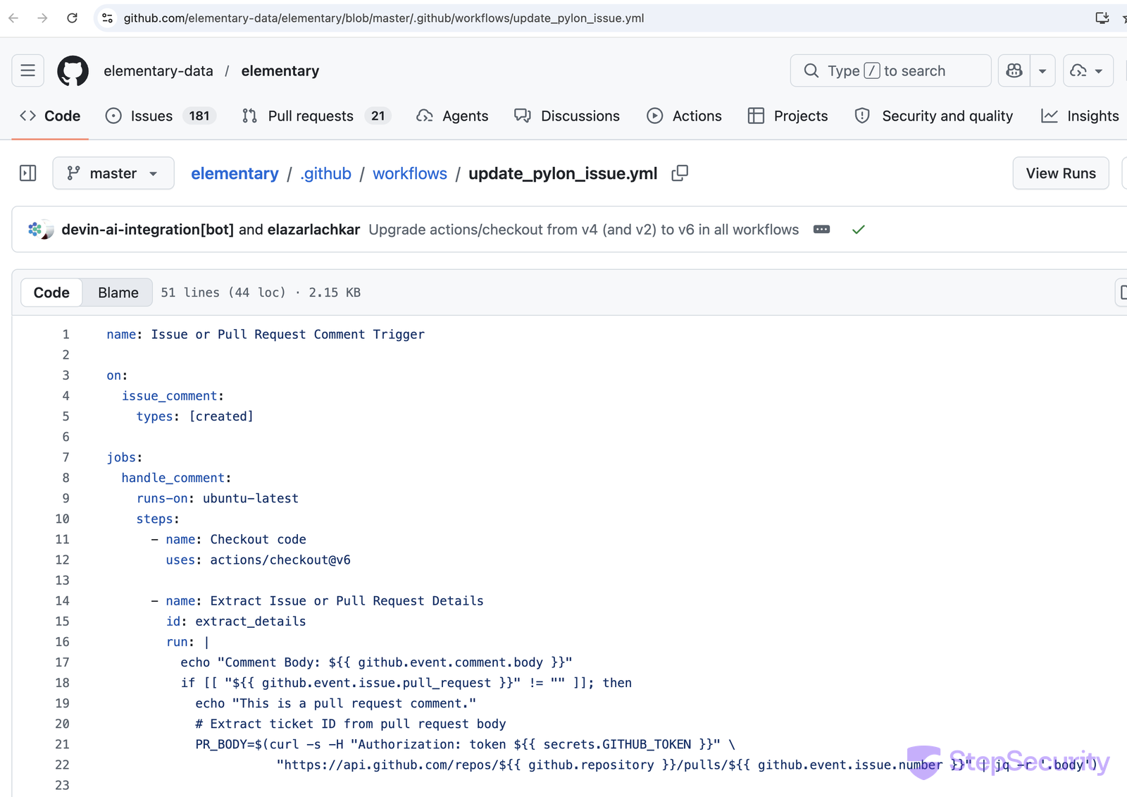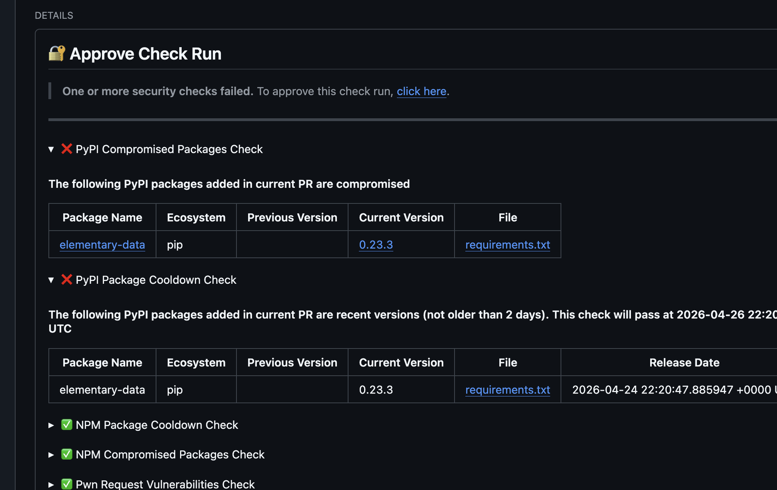The PyPI Compromised Package Check blocks pull requests that introduce a known-malicious version. elementary-data==0.23.3 has been added to the list. The PyPI Package Cooldown Check would also have flagged a PR that adopted 0.23.3 for being too newly published to trust, holding it for review until the cooldown window elapsed.