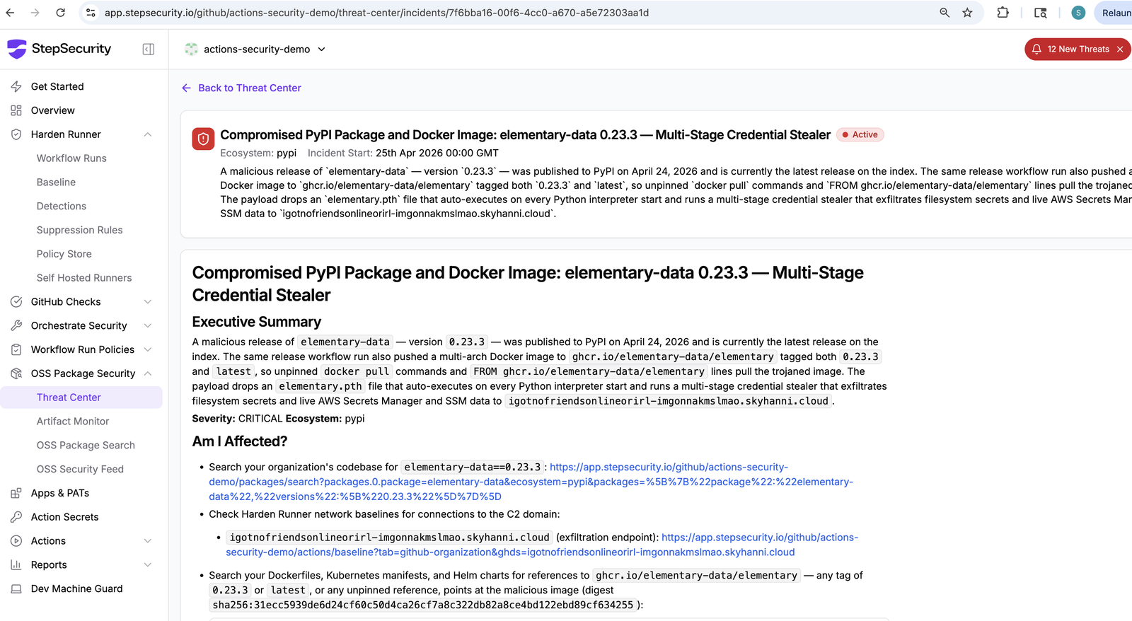 StepSecurity operates a 24x7 Security Operations Center that continuously monitors npm, PyPI, GitHub Actions, and the wider open-source ecosystem for supply chain attacks. When the SOC confirms a compromise, the StepSecurity Threat Center publishes a real-time advisory to our customers with "Am I Affected?" links pre-wired to that tenant's own codebase, CI baselines, and developer-machine inventory and the relevant indicators are pushed to downstream protections (Harden-Runner global block list, Compromised Package Check, Developer MDM, etc.) so they take effect across every workflow without any customer configuration change.
