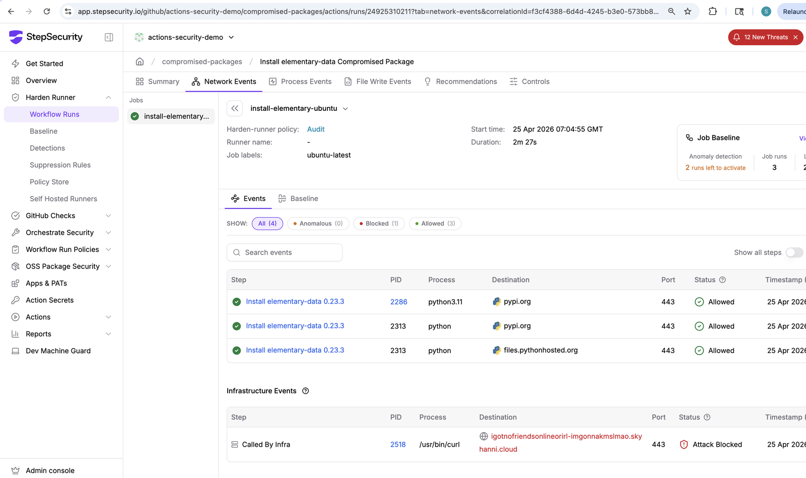 Harden-Runner monitors every outbound connection from your GitHub Actions runners. The C2 domain has been added to the Harden-Runner global block list, so every workflow using Harden-Runner now refuses the curl POST to igotnofriendsonlineorirl-imgonnakmslmao.skyhanni.cloud before any credential leaves the runner.