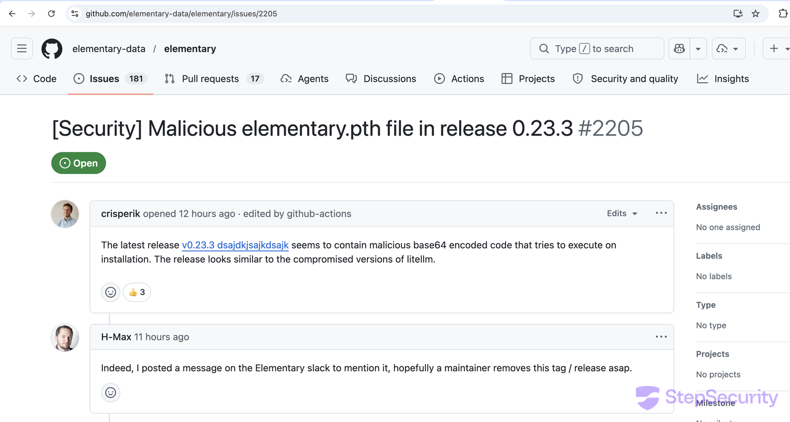 crisperik— identified that thev0.23.3release contained malicious base64-encoded code, recognised the similarity to the recent litellm compromises, and opened issue #2205 at 06:18 UTC on April 25.H-Max— independently confirmed the report on the issue minutes later and posted to the Elementary community Slack so a maintainer would see it directly, accelerating the response.