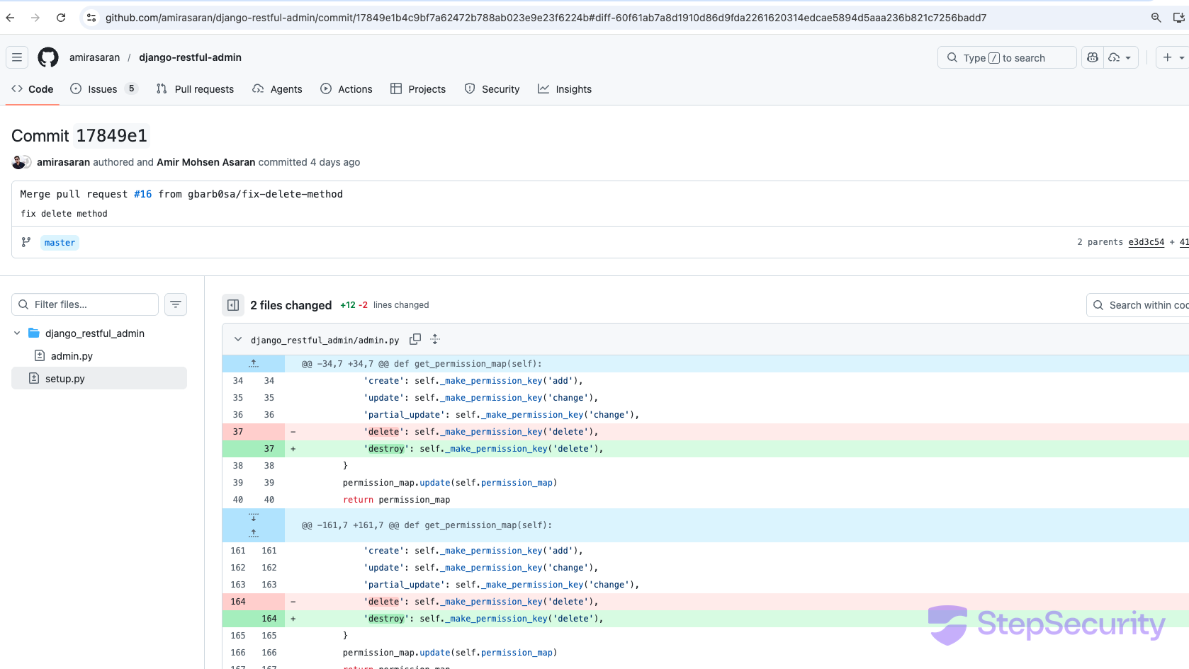 The GitHub Events API captures push events with before and after commit SHAs. For amirasaran/django-restful-admin, we can see the exact moment the default branch was replaced: