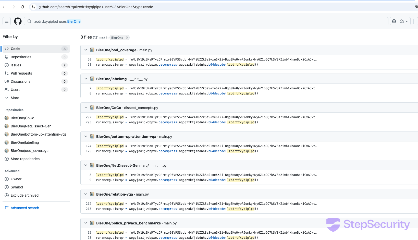 The full list of affected repositories can be found by searching GitHub for the malware's marker variable: