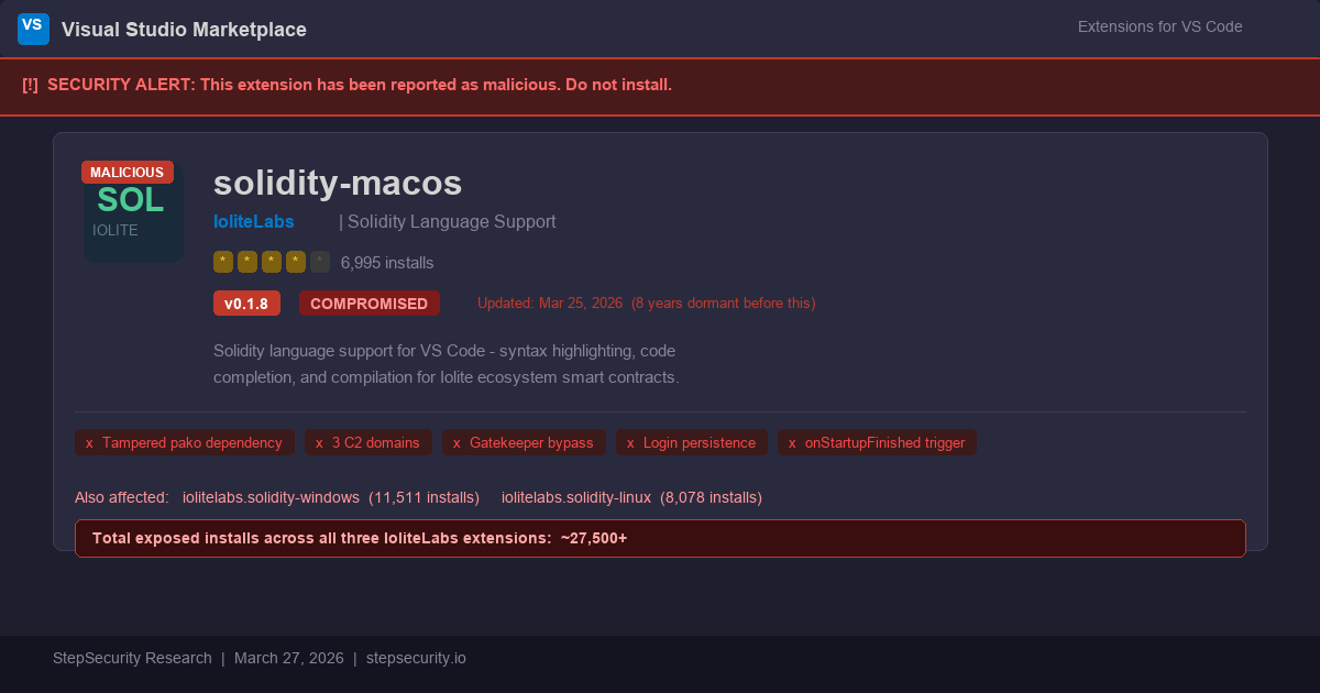 The IoliteLabs publisher account on the VS Code Marketplace hosts three Solidity language support extensions - solidity-macos, solidity-windows, and solidity-linux - first published in July 2018 for the Iolite ecosystem, an Ethereum-compatible blockchain platform. None of the three had been updated in nearly eight years. On March 25, 2026, all three were simultaneously updated to version 0.1.8 on the Marketplace. The solidity-macos VSIX dropped from 35-40 MB to 2 MB. All three had their Solidity language server gutted and replaced with five stub commands, leaving only enough UI surface to appear functional while delivering a multi-stage backdoor silently in the background.