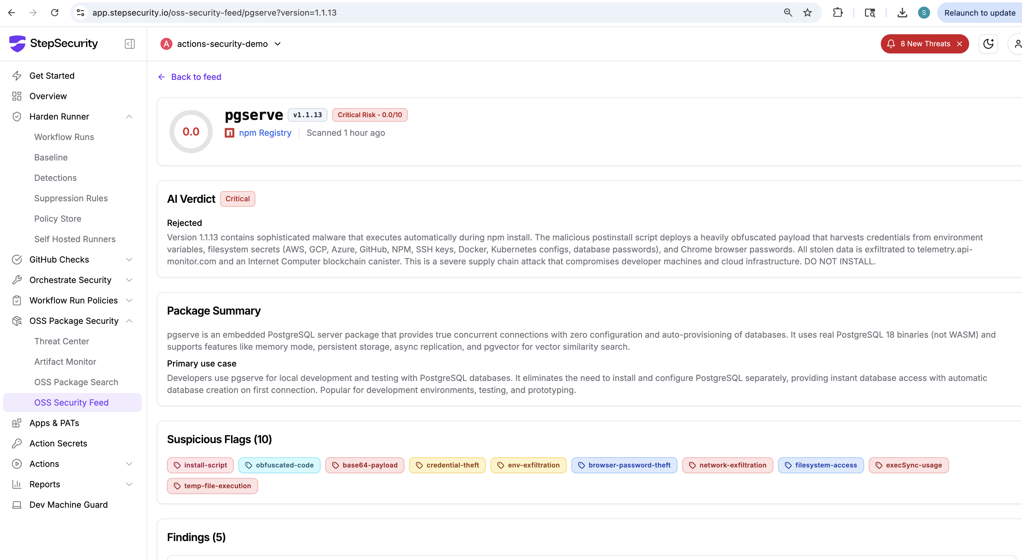 This compromise was detected through two independent signals: the StepSecurity AI Package Analyst, which flagged all three compromised versions with a Critical / Rejected verdict, identifying credential theft, env exfiltration, browser password theft, and network exfiltration; and Harden Runner, which captured the malware's exfil connections during a controlled analysis run.