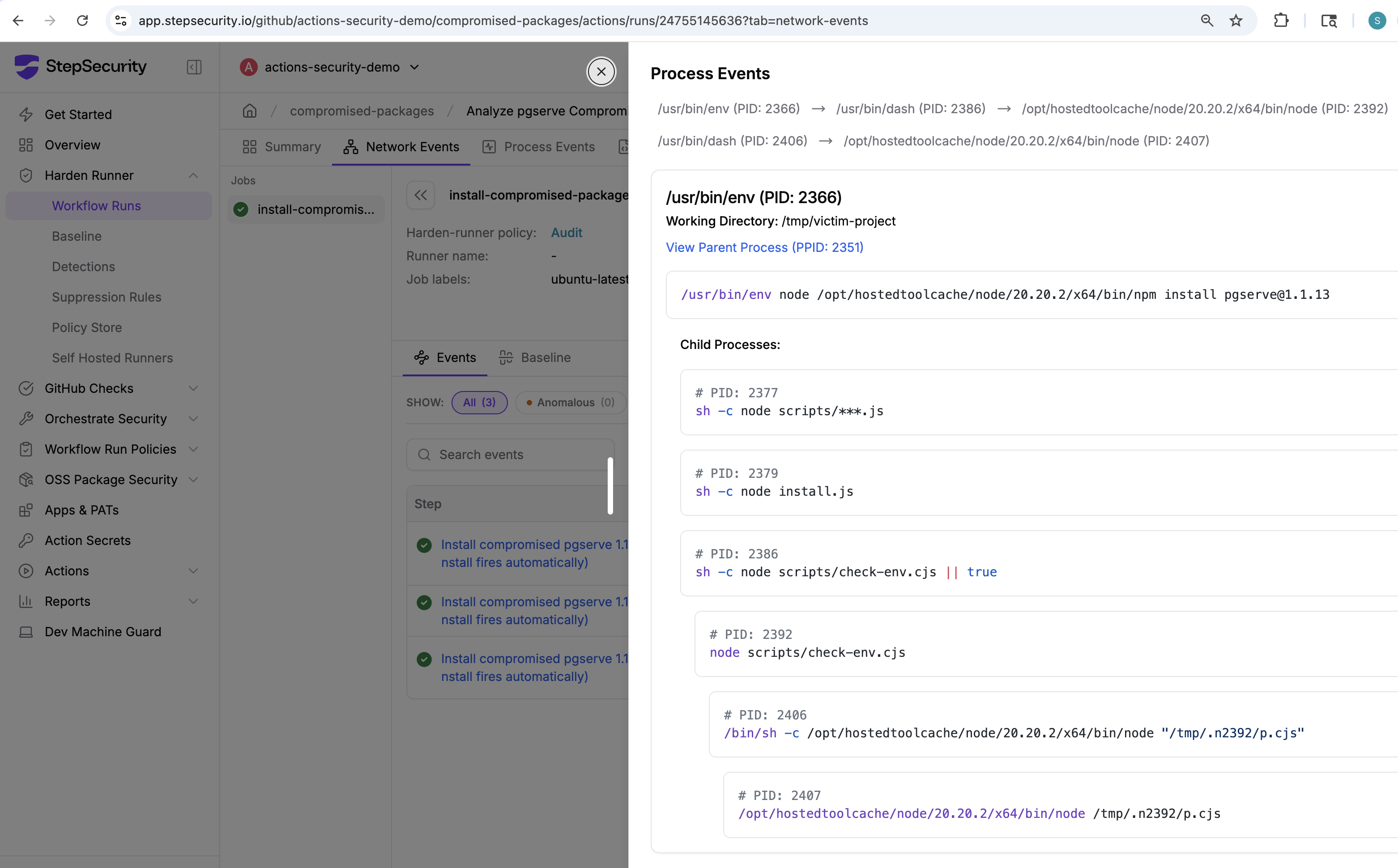 StepSecurity ran the compromised package in a controlled GitHub Actions environment with Harden-Runner in audit mode.