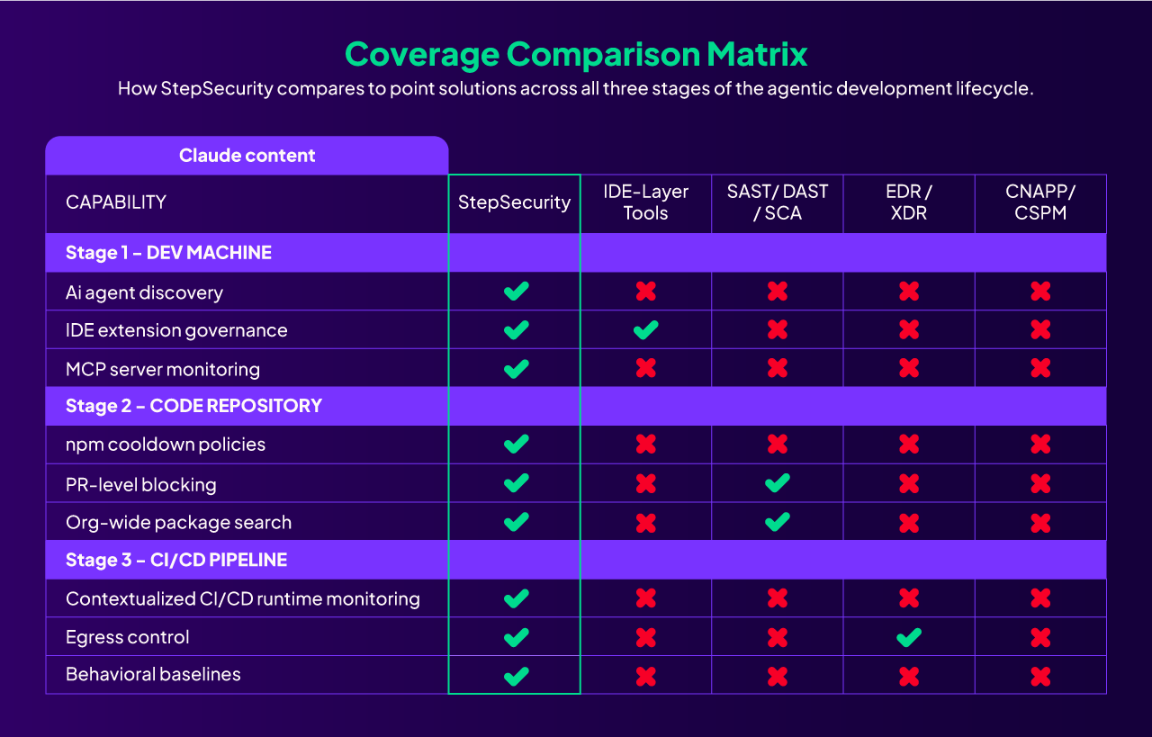 IDE-layer solutions scan AI-generated code or govern plugins but provide zero visibility into CI/CD pipelines or npm supply chain attacks at scale. SAST/DAST tools scan code output but don't monitor agent runtime behavior. EDR/XDR lacks CI/CD context. CNAPP/CSPM is built for cloud infrastructure, not ephemeral runners or developer workstations.