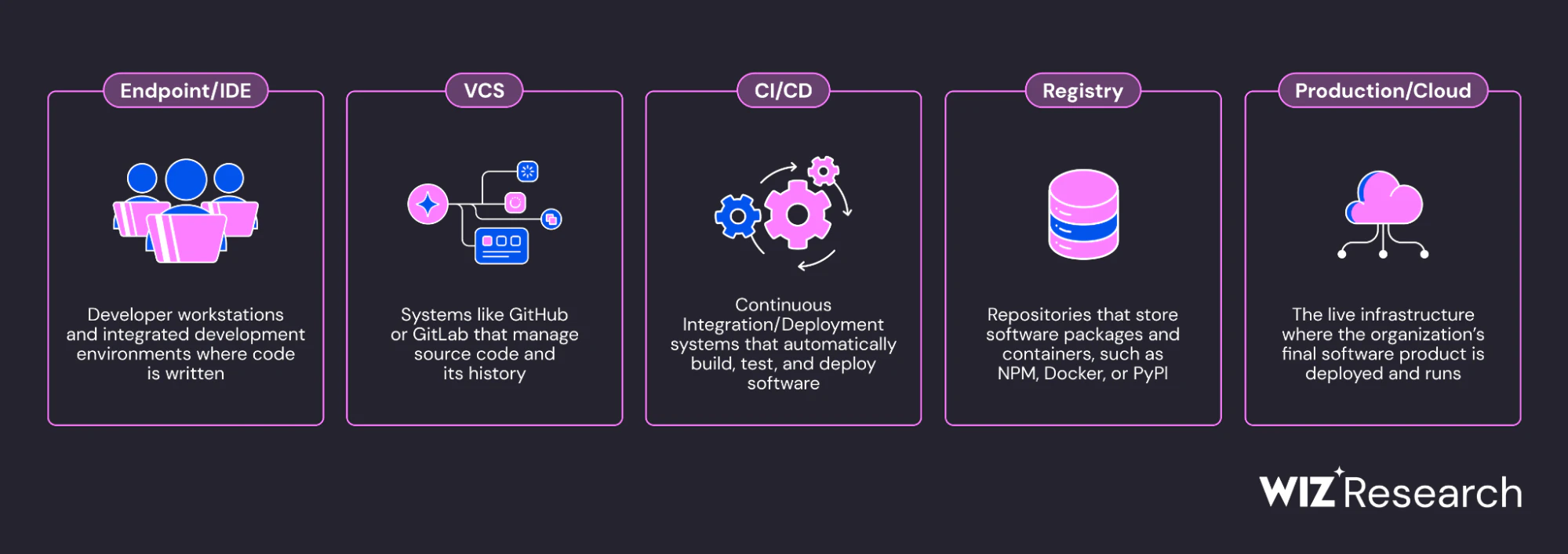 The recent introduction of SITF (SDLC Infrastructure Threat Framework) by Wiz represents important progress in mapping supply chain threats. Their framework correctly identifies the five critical pillars under attack: