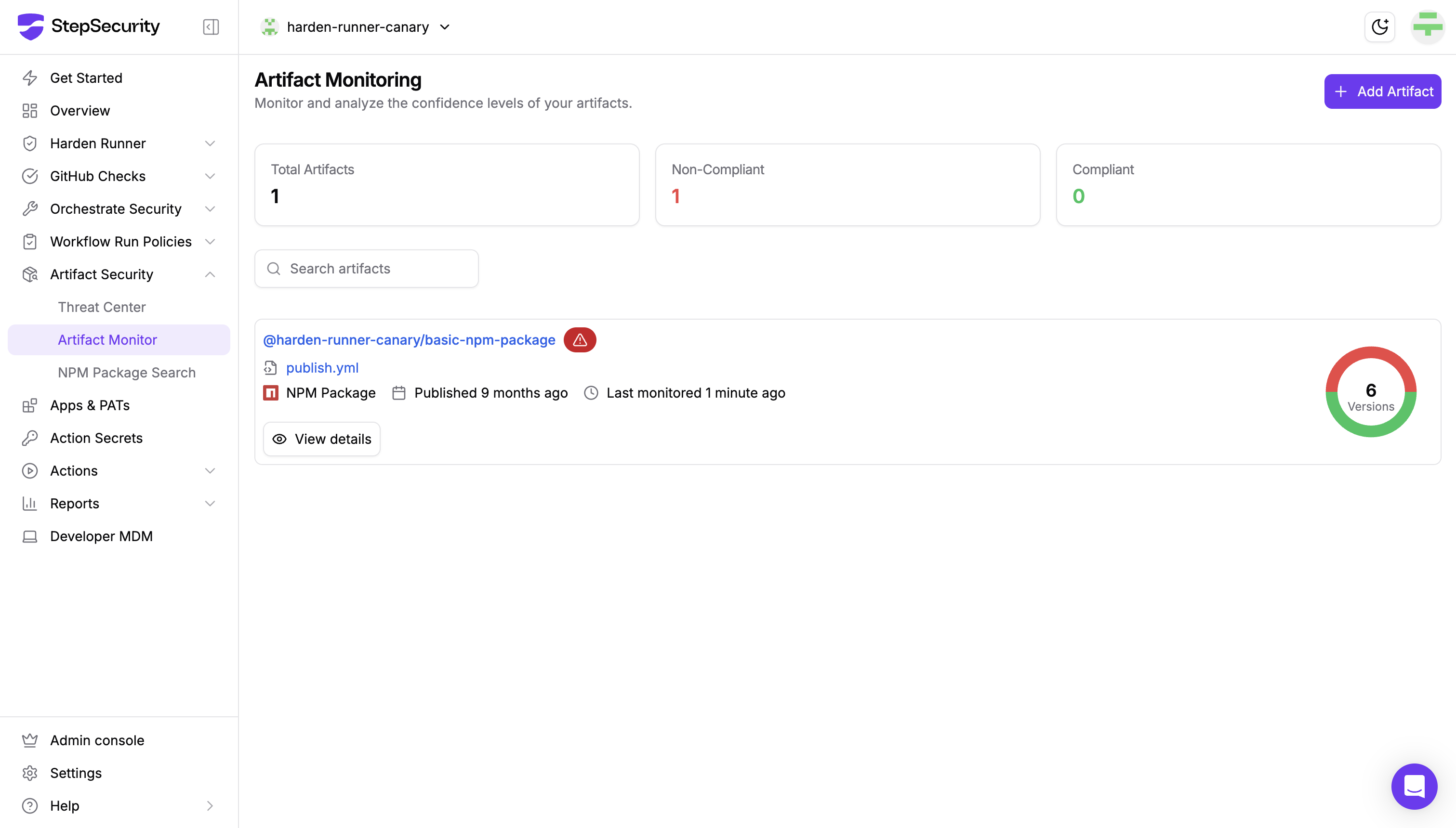 Product: Artifact Monitor + npm Package Search Protection: Artifact integrity verification, malicious package detection, registry monitoring