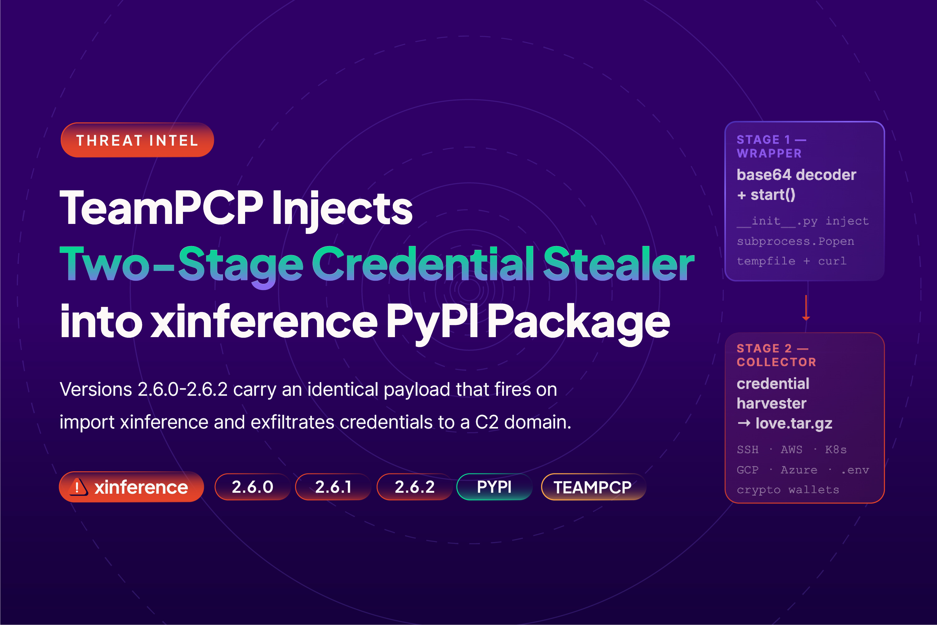 On April 22, 2026, three consecutive releases of xinference on PyPI — versions 2.6.0, 2.6.1, and 2.6.2 — were confirmed to carry a two-stage credential-stealing payload injected directly into xinference/__init__.py. The malware executes the moment any application runs import xinference, decodes a second-stage collector, harvests SSH keys, cloud credentials, environment variables, crypto wallets, and more, then exfiltrates everything as love.tar.gz via curl POST to the attacker-controlled domain whereisitat.lucyatemysuperbox.space. All three versions have been yanked from PyPI.