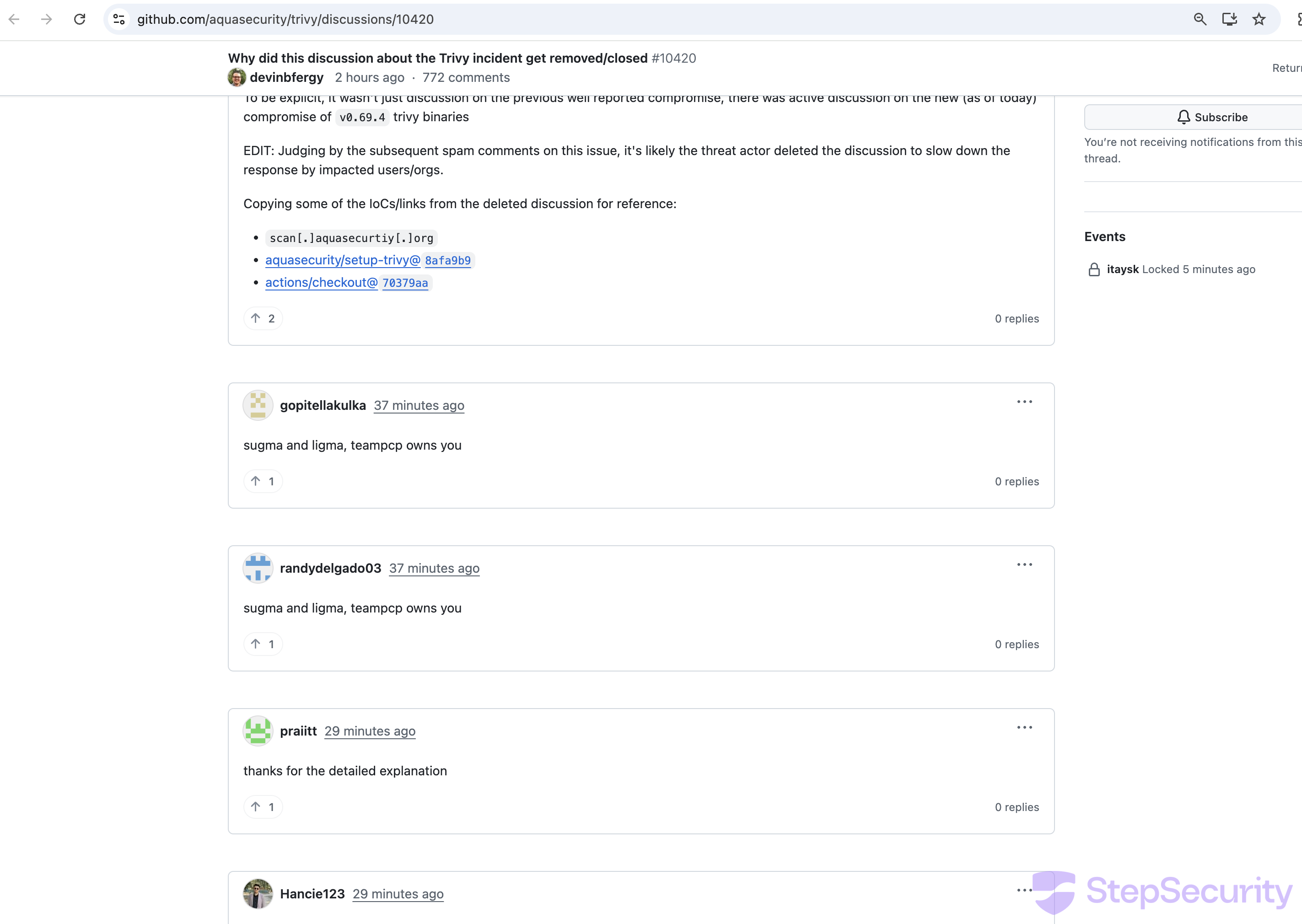- Discussion #10420: Why did this discussion about the Trivy incident get removed/closed