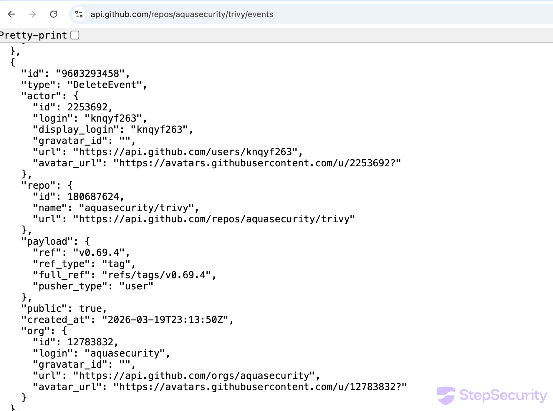 DeleteEvent—aqua-botdeletesv0.70.0tag at 17:51 UTCCreateEvent—github-actions[bot]creates branchci/helm-chart/bump-trivy-to-0.69.4at 18:30 UTCPullRequestEvent—aqua-botopens helm chart bump PR at 18:30 UTCDiscussionEvent—devinbfergyopens discussion #10420 at 22:13 UTCDeleteEvent—knqyf263deletesv0.69.4tag at 23:13 UTC