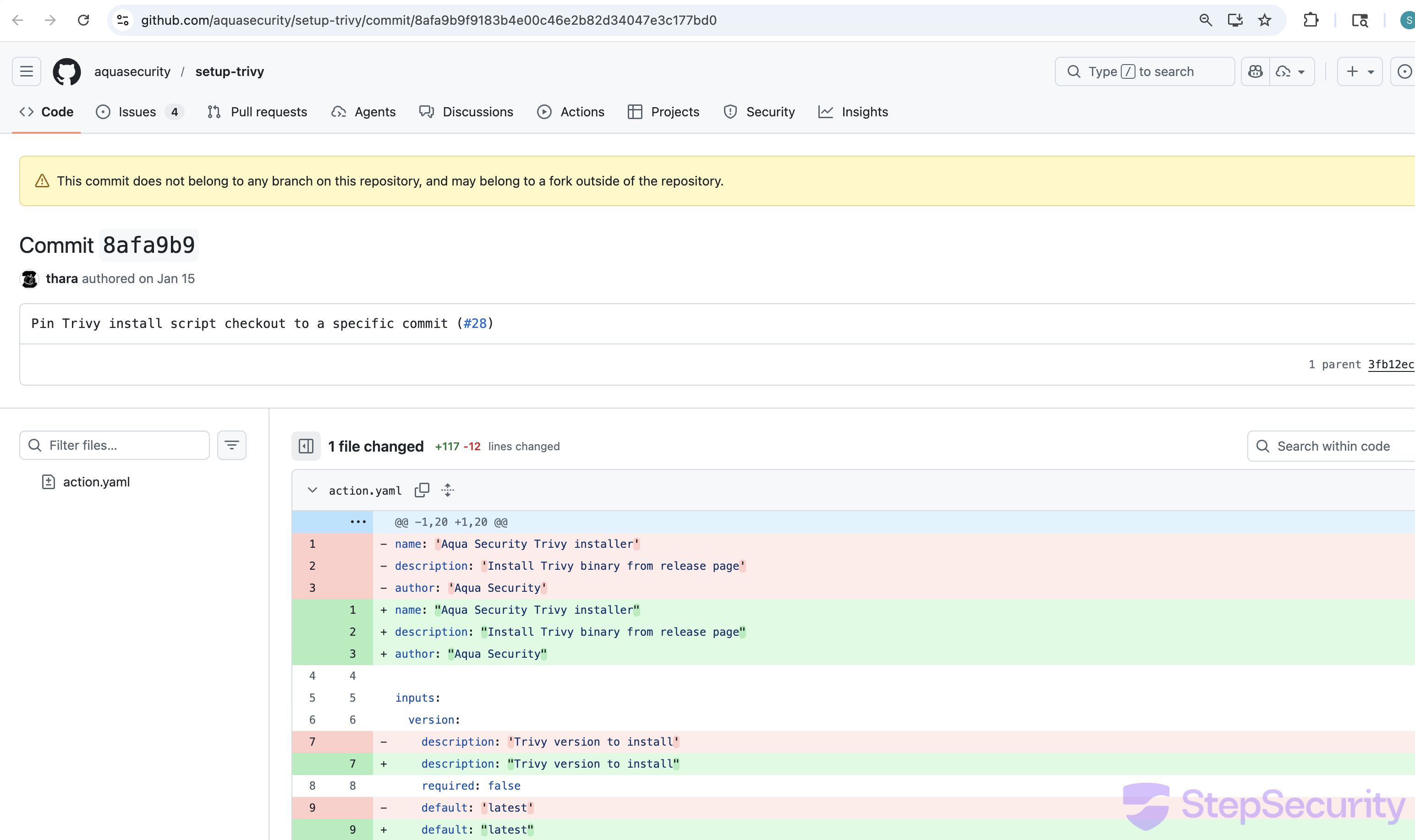 GitHub displays a warning on commit 8afa9b9: "This commit does not belong to any branch on this repository, and may belong to a fork outside of the repository." The commit is built on top of the legitimate 3fb12ec (current main HEAD) and uses the same commit message — "Pin Trivy install script checkout to a specific commit (#28)" — as a disguise. The legitimate commit has 4 additions; the malicious one has 117 additions and 12 deletions.