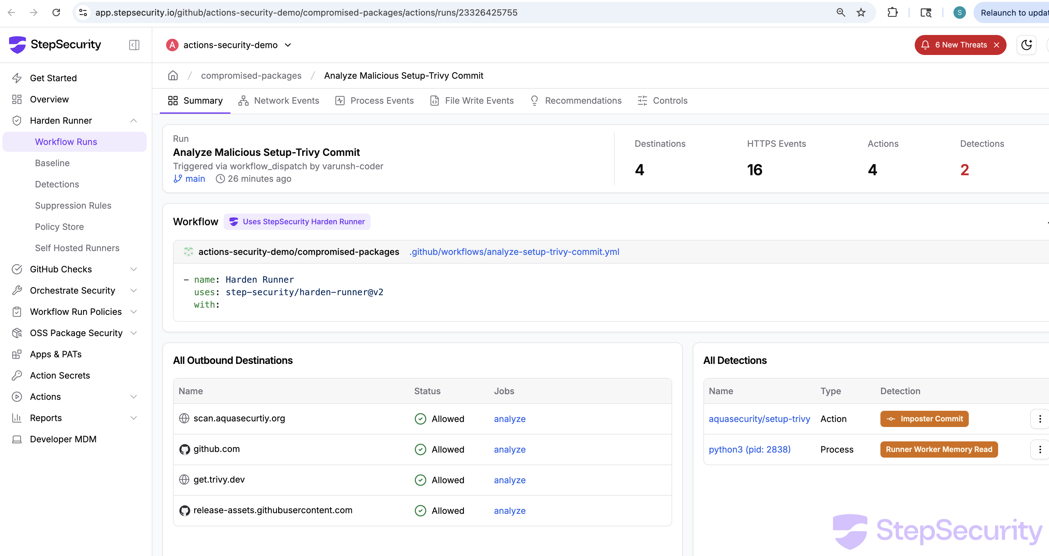- Summary: app.stepsecurity.io/github/actions-security-demo/compromised-packages/actions/runs/23326425755