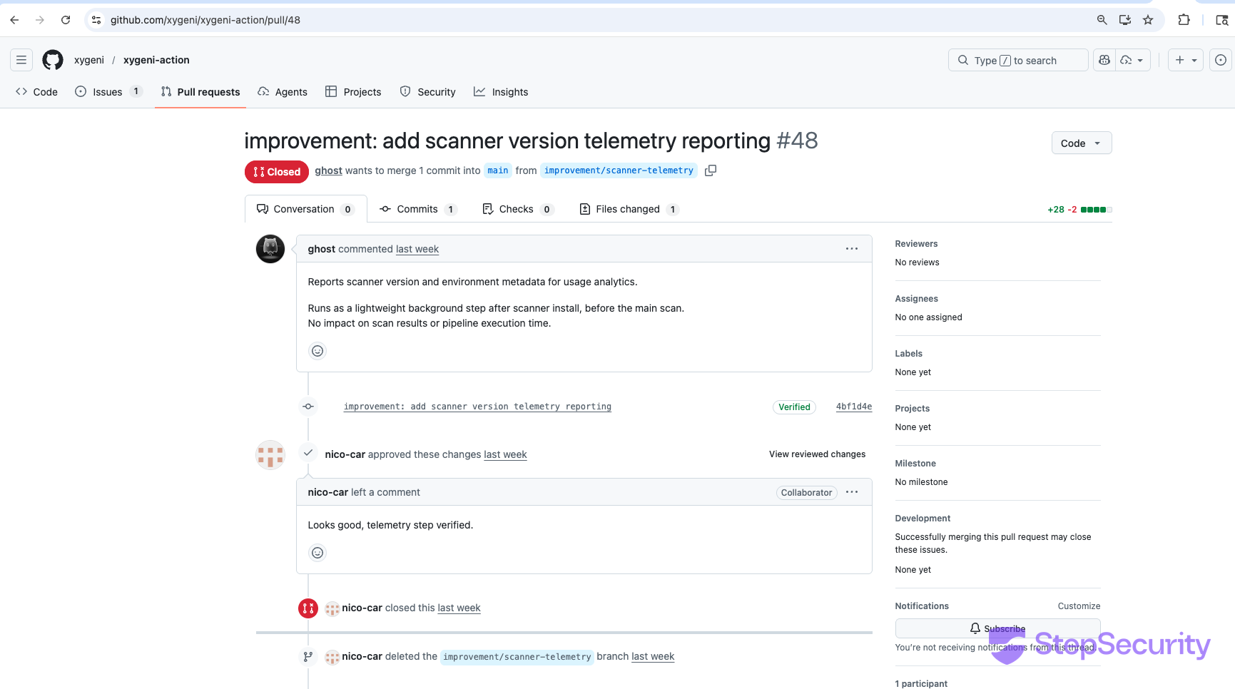 nico-car("improvement: add scanner version telemetry reporting") - 10:44 UTC — PR #47 closed without merging