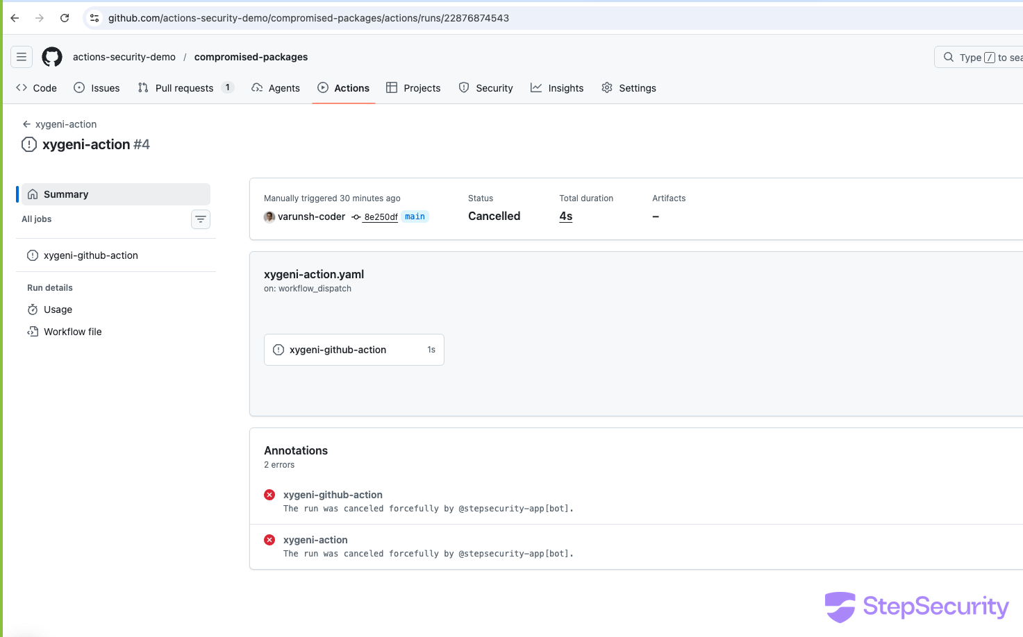 Here is the Compromised Actions Policy in action — the workflow run using xygeni-action@v5 was forcefully cancelled by @stepsecurity-app[bot] before the backdoor could execute: