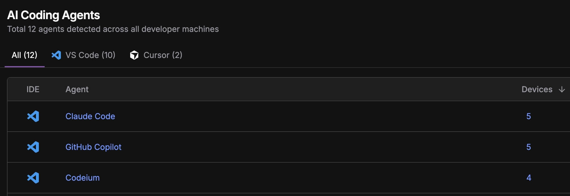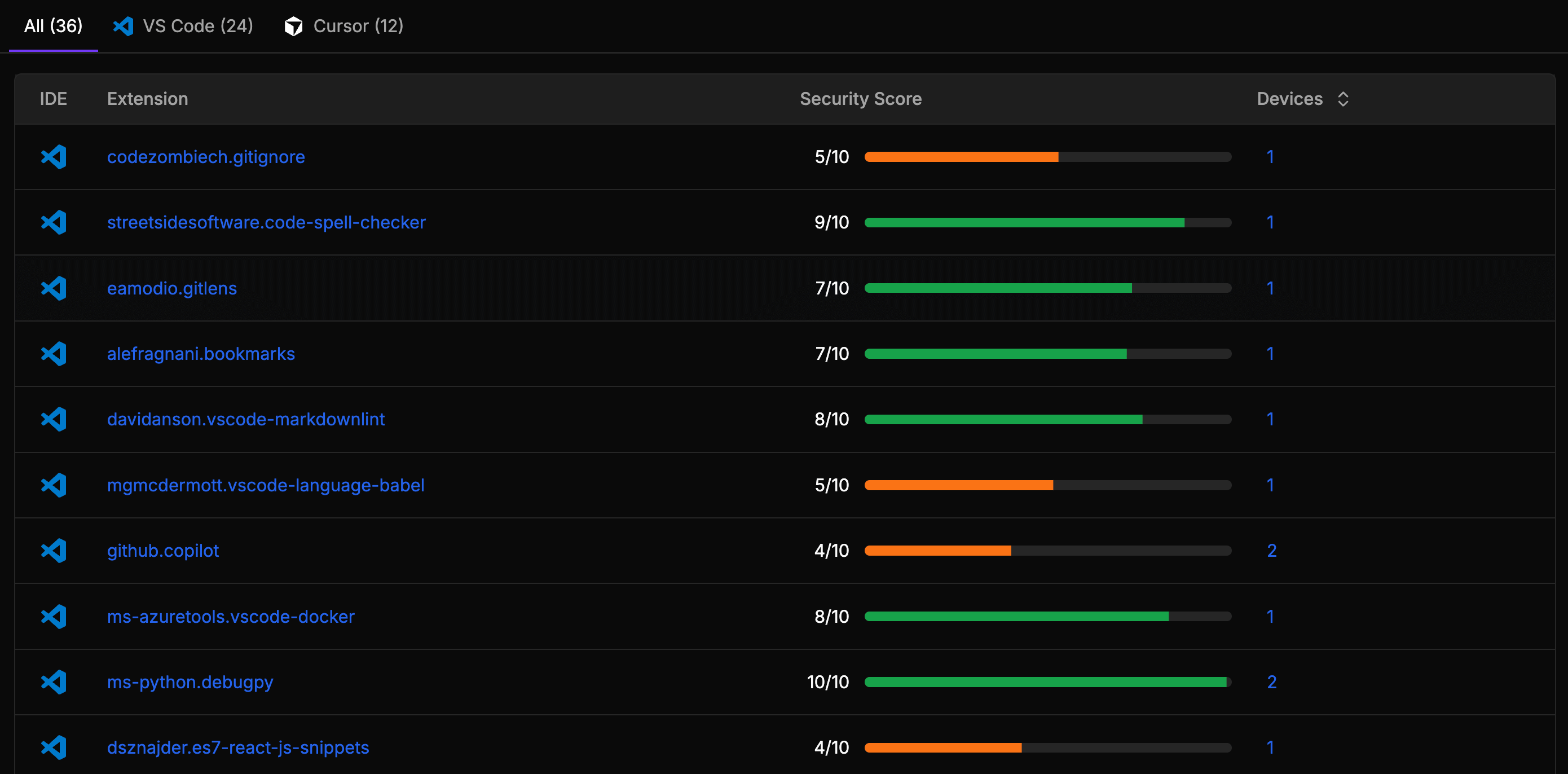 Track all installed extensions across VSCode, Cursor, JetBrains, and Windsurf IDEs organization-wide.